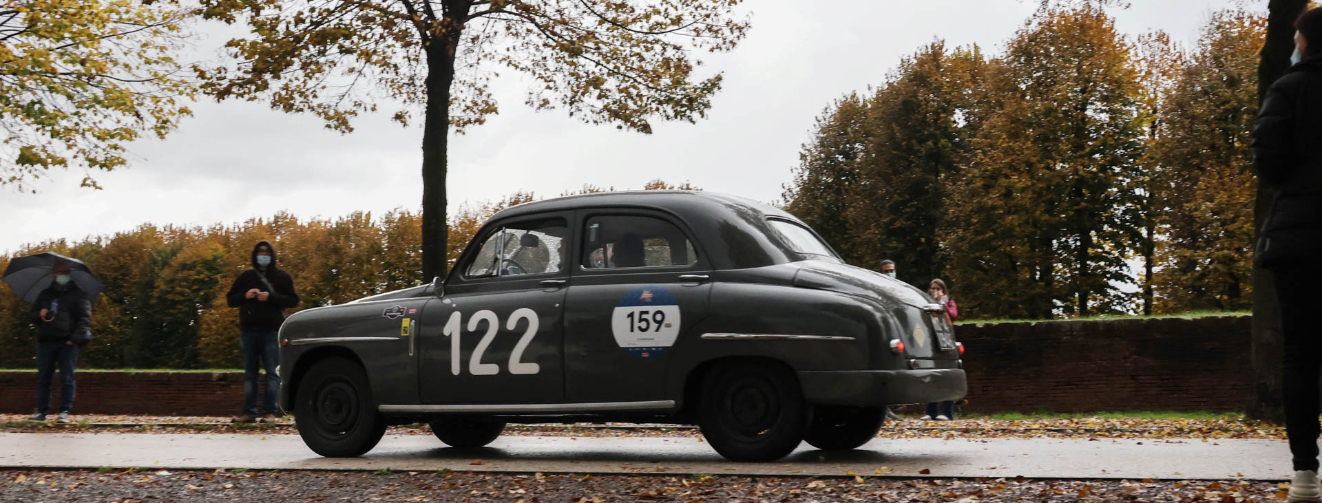 Lo spirito giusto. Basta un filo sottile d’immaginazione per trasformare l’attraversamento di Altopascio, Montecarlo, San Miniato in un tuffo all’indietro nel tempo, nell’Italia del 1955. Il tricolore pavesato da un palazzo all’altro, i rumori degli scarichi liberi che rimbalzano sulle strette strade dei centri storici, le ali di folla che acclama. L’altra icona di giornata è l’equipaggio olandese Theme/Willemse, che ricambia il calore e l’entusiasmo dei saluti con ampi gesti sulla loro piccola Autobleu 750 Mille Milles, costruita appositamente dalla Carrosserie G.T.R. per la più amata delle corse italiane. Sanno di essere maledettamente fortunati a trovarsi qui e ora, nonostante il tempaccio; e non smettono di condividerlo con chi sa apprezzarlo. È questo, lo spirito giusto. I momenti indimenticabili della giornata si susseguono come in un film. Mentre la radio dà notizie di chiusure imminenti, li riceviamo come regali insperati e preziosi. La salita a Piazza del Campo di Siena schiude lo sguardo alla Conchiglia tappezzata di bianco, rosso e verde tra le file dei bolidi parcheggiati per la veloce, anzi sbrigativa pausa pranzo. Per chi ha velleità di vittoria, podio o anche solo buona classifica, non c’è tempo da perdere. Usciti da Siena torna a scatenarsi l’iraddiddio, che non si placa nemmeno al cospetto delle Mura di Lucca. Una delle prove cronometrate si svolge proprio in posizione sopraelevata, sugli spalti intatti che abbracciano la città, in una pioggerellina di foglie gialle.
