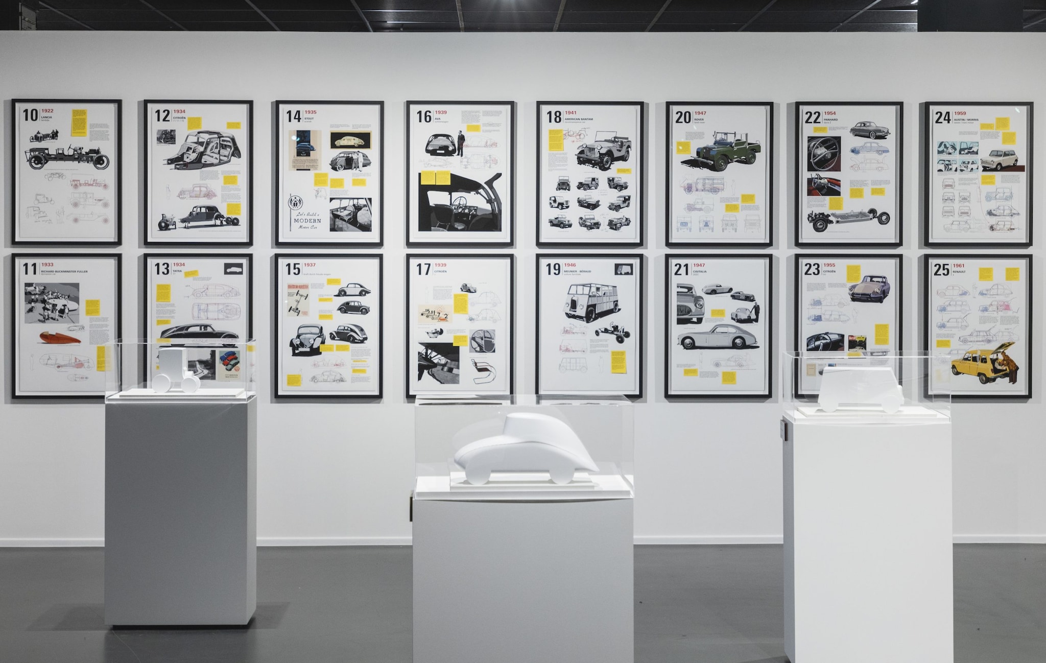 Al centro dell’esposizione 44 opere, tra testi e immagini, ripercorrono la storia dell’automobile a partire da modelli spesso rimasti ai margini della produzione industriale, con due proiezioni video che offrono una panoramica sui disegni tecnici. Altro elemento centrale della mostra è “A l’abri du vent et de la pluie” (Al riparo dal vento e dalla pioggia), un’opera composta da dieci modelli in scala 1:10 provenienti dalla “Fondation Cartier pour l’art contemporain”, l’ente che ha affidato all’artista lo sviluppo del progetto. Queste miniature, ridotte all’essenzialità delle forme, si concentrano sui tratti fondamentali che rendono ogni modello immediatamente riconoscibile. A completare l’allestimento, appunti e schizzi consentono di entrare nel processo creativo dell’artista.