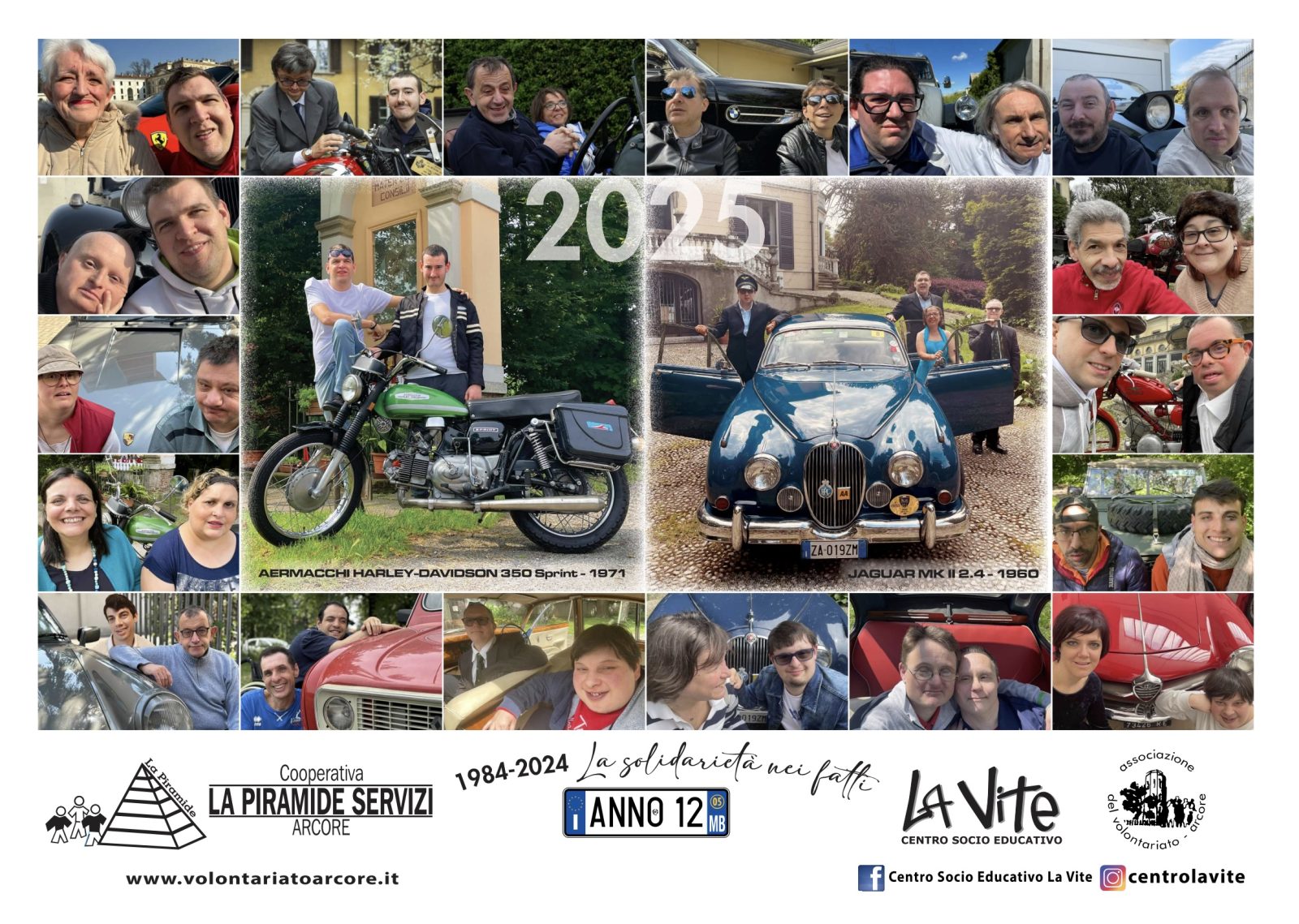 Quando la solidarietà si sposa con la passione nascono cose belle. La cooperativa La Piramide Servizi di Arcore, ogni anno realizza un calendario , da parete e da scrivania, con il duplice scopo di impegnare la trentina di adulti disabili ospitati nel suo centro e di raccogliere fondi per le sue attività di volontariato. Il tema dell'edizione 2025 è "Auto e Moto d'Epoca".