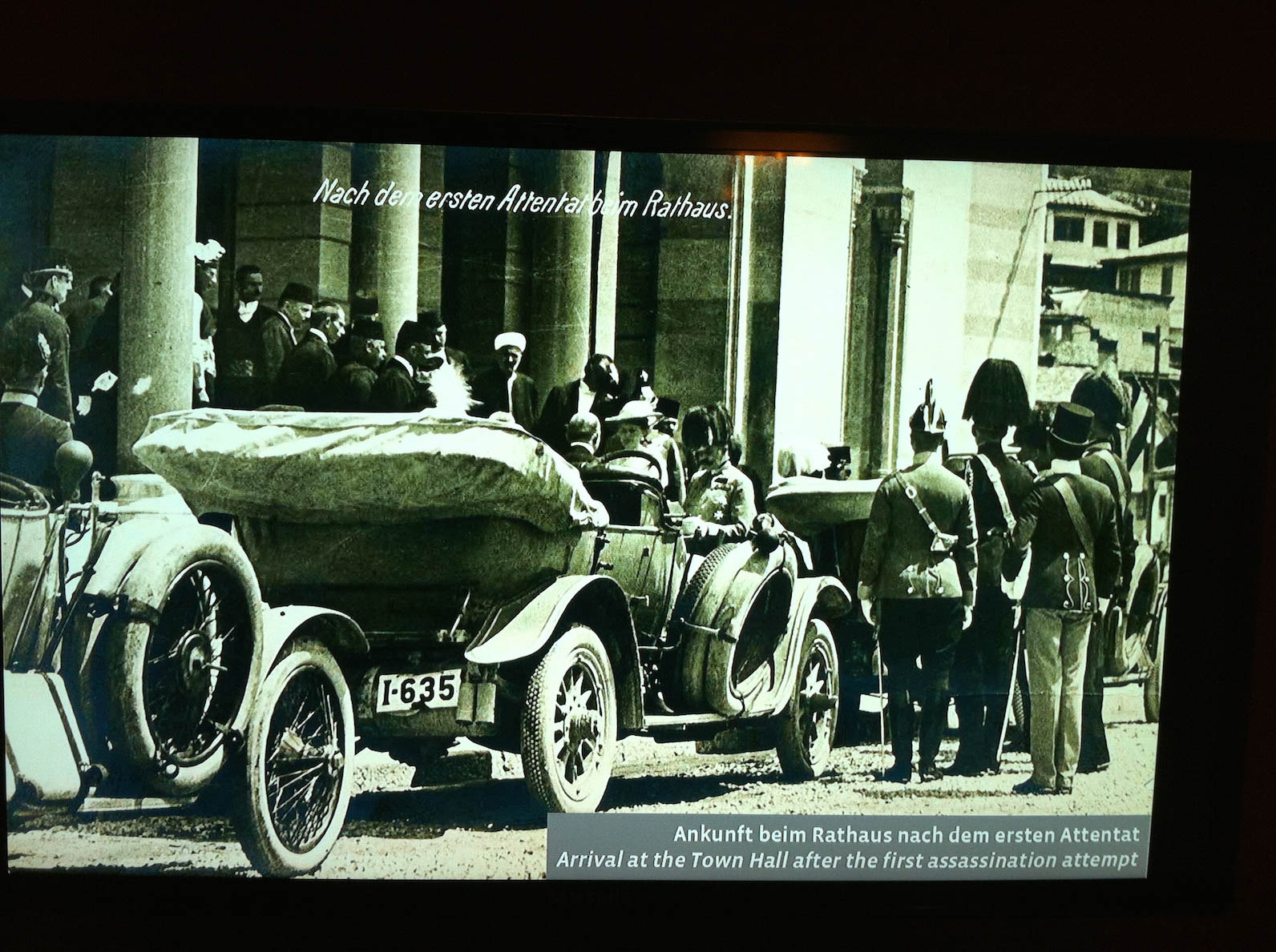 Giornata infausta. I fatti che riguardano il manipolo di attentatori, tutti tra i 17 e i 20 anni, sono abbastanza noti e per chi volesse rispolverarli è pronto in libreria il bel "Una mattina a Sarajevo" di David James Smith, edizioni LEG. Dovendo però restare dal punto di vista della automobile, immaginiamola caricarsi del proprietario conte Harrach, del suo autista, del Governatore Potiorek e della augusta coppia, per condurre tutti in municipio, ad ascoltare i discorsi di circostanza. Il viaggio dalla stazione, con sette automobili in tutto, è abbastanza breve, due piccole ali di folla cingono spesso il corteo. Alle 10.15 entra in scena il primo attentatore, ma la velocità del passaggio e la vista delle loro Maestà tra la folla - forse più quella della moglie innocente che quella dell’Arciduca - paralizza l’azione: la granata del carpentiere Mehmedbasic resta nascosta sotto la giacca. Poco più avanti è pronto Nedjo Cabrinovic, operaio anarchico 19enne, che lancia invece la sua bomba. Questa urta la fiancata dell’auto, non scoppia, rotola sul selciato ed esplode sotto una vettura al seguito causando numerosi feriti. E qui avviene l’incredibile. Mentre l’attentatore è braccato nel fiume in cui ha cercato di suicidarsi, in pieno trambusto cittadino, ospiti e autorità decidono di continuare il programma. L’unica cosa che cambia sono le parole di Francesco Ferdinando, che - giunto al municipio - interrompe il saluto ampolloso del sindaco gridando, “ma mi faccia il piacere! Vengo in visita alla vostra città e ci accogliete con una bomba”. Le facce della variopinta delegazione che porge i suoi omaggi al futuro imperatore sono da paura. Le istantanee scattate all’ingresso restituiscono tutto il dramma del momento.