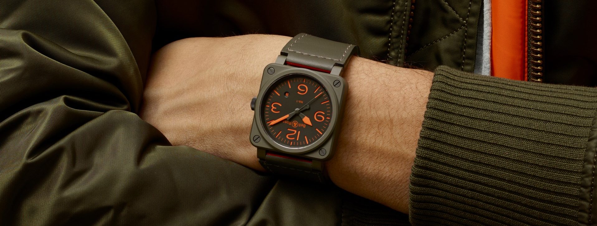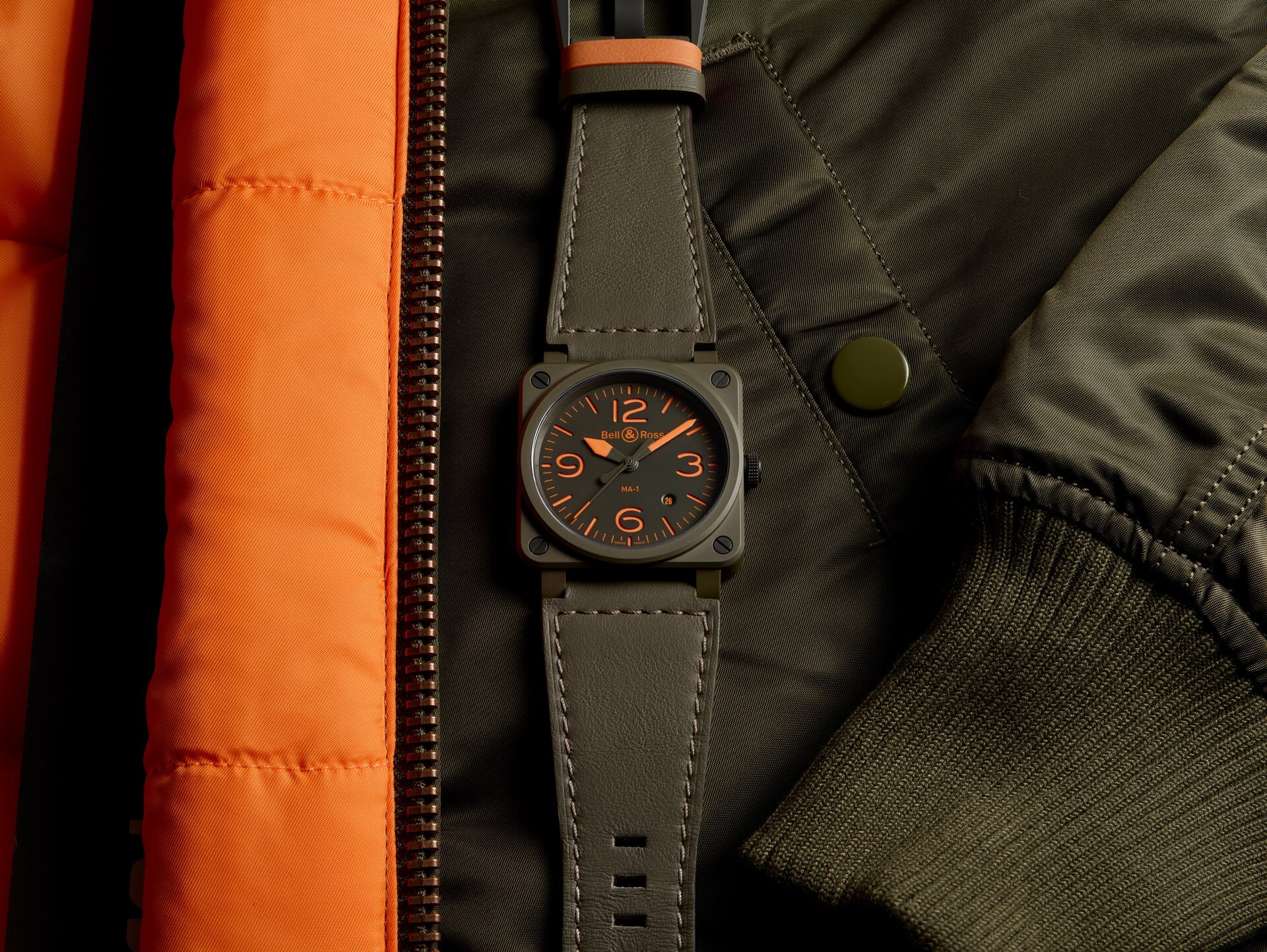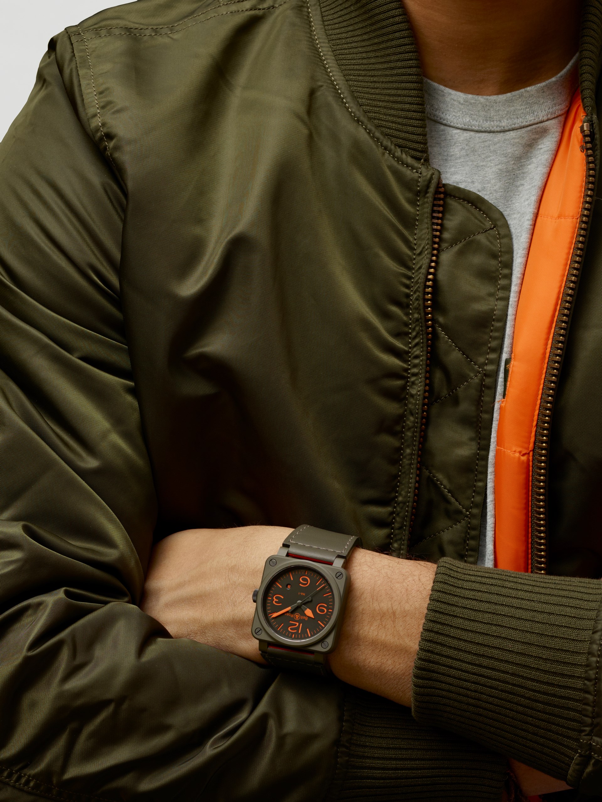 L'orologio. Una delle anticipazioni più interessanti, dal punto di vista stilistico e d’immagine, viene appunto da un marchio giovane e indipendente come Bell & Ross, che fin dal 2005 ha puntato sull’ispirazione al mondo dell’aviazione, da sempre importante punto di riferimento per l’orologeria. Prendendo come modello la strumentazione della plancia di comando degli aerei, generalmente di forma quadrata e che quindi si poteva facilmente e con successo smarcare dalla tradizionale forma tonda degli orologi. Questa volta però, la particolarità estetica che maggiormente colpisce nel modello BR 03-92 MA-1 non è il riferimento, ad esempio, agli altimetri o alle bussole di bordo, ma la scelta di creare un nesso con il “bomber”, il famoso giaccone in uso durante gli anni ’50 ai piloti militari, in materiale sintetico, reversibile e con doppio colore, verde (mimetico) e arancione (di soccorso). Elementi ripresi dall’insieme dell’orologio, in particolare dal cinturino.