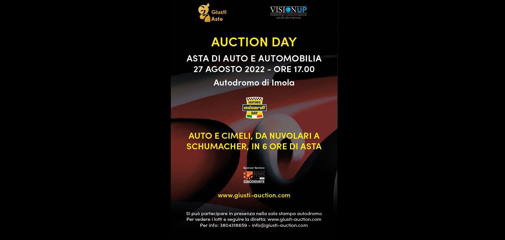 Giusti Aste e Vision Up, durante la manifestazione Historic Minardi Day, propongono il 27 agosto, dalla 17, un incanto di sei ore in presenza e su varie piattaforme (collegandosi a liveauctioneers) all’Autodromo “Enzo e Dino Ferrari” di Imola. In vendita auto, moto, cimeli, giocattoli d'epoca, opere d'arte varia.