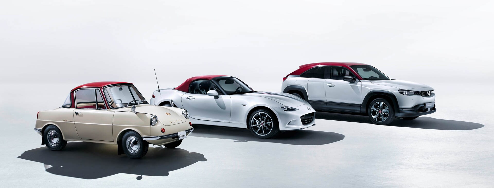 Una festa per gli occhi. L’arrivo della televisione a colori in Europa coincise con la prima serie di Mazda 323 del 1977, la hatchback che vantava colori intensi come il Muscat Green, l’Impulse Blue, il Grand Prix Red e il Sunbeam Silver Metallic. Il vivacissimo verde/arancio della 787B che corse alla 24 Ore della Sarthe nel ’91 fu ripresa anche nella serie limitata e commemorativa di MX-5 “Le Mans” del 2011. La filosofia Takuminuri ha portato in dote tinte brillanti come il giallo Sunracer’s Sunburst del 1995, lo Spirited Green della MX-5 Karai del 2011; e il Racing Orange della MX-5 30° Anniversario 2019, giusto per nominarne alcuni. L’abbinamento bicolore della R360 è stato ripreso nel 2020 per le serie speciali celebrative del 100° Anniversario, che sfoggiano la carozzeria bianca e gli interni bordò. Mentre un’edizione limitata delle MX-5 e MX-30 sfoggeranno la stessa livrea cromatica della prima microutilitaria, con il tetto in rosso vinaccia. I classici, si sa, non invecchiano.