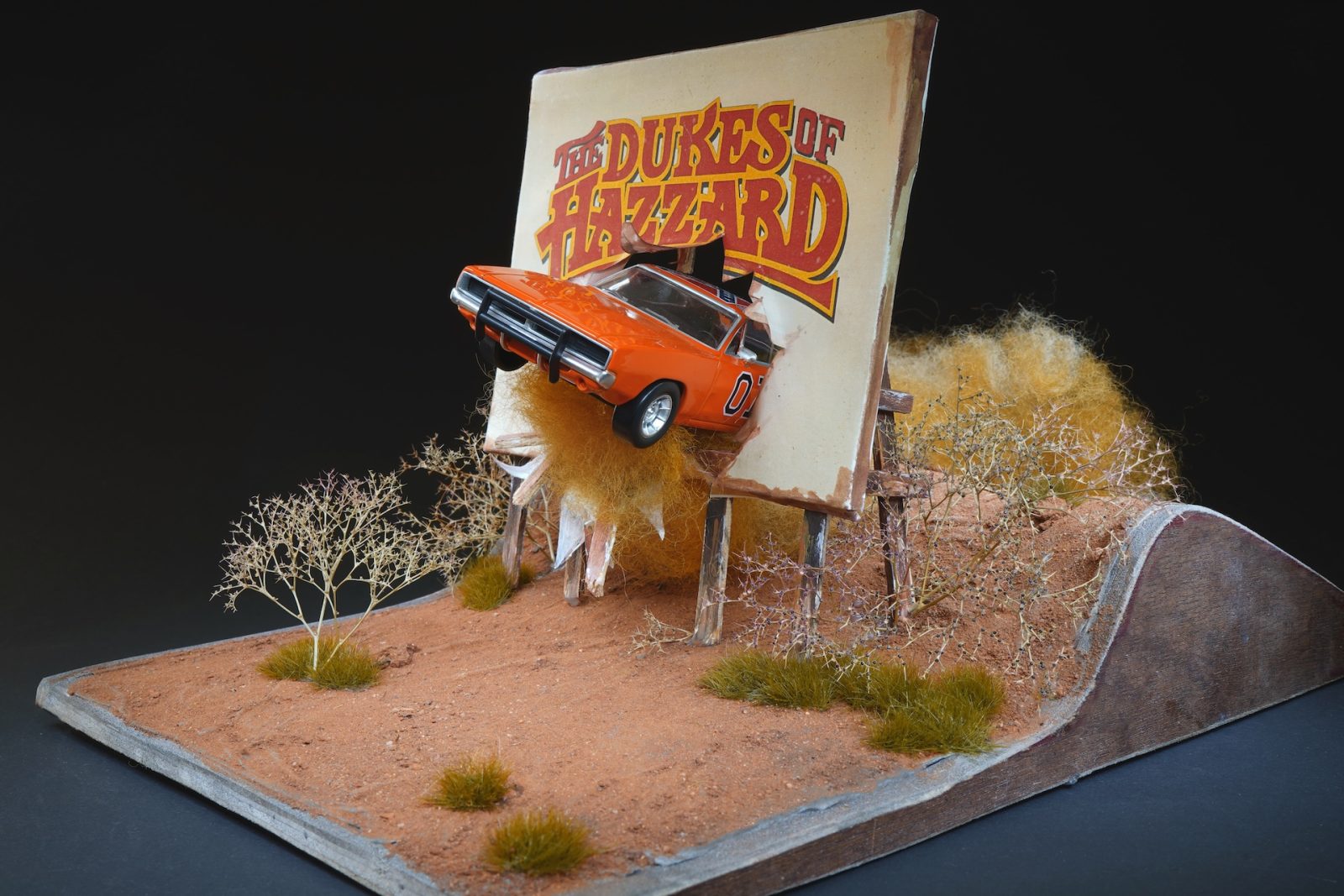 "Lascio sempre che a ispirarmi sia il modello", racconta Ferrari. "L’ho appoggiato su una base di legno da 30 centimetri per 25: il "Generale Lee" doveva saltare!". Da qui parte la costruzione del diorama, con la volontà di ricreare un'azione dinamica e scenografica. Sulla base ha disegnato i riferimenti principali, immaginando l’auto lanciata in volo da una collina mentre sfonda un cartellone pubblicitario dedicato alla celebre serie.