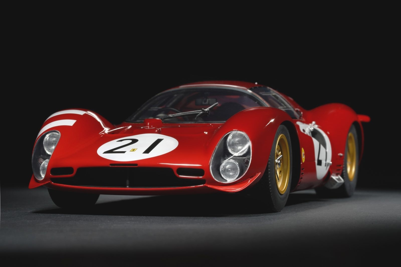 La carrozzeria, in un rosso lucido e pieno, è realizzata alla perfezione ed è liscia come una goccia d'acqua. L’avantreno è un capolavoro di pulizia aerodinamica: fari carenati sotto cupole trasparenti perfettamente profilate e prese d’aria ben dimensionate, con la grande targa bianca e il numero 21 che troneggia al centro del cofano, millimetricamente calibrata nella dimensione. Il profilo laterale e le bombature dei passaruota sono riprodotti con una modellazione che riesce a trasmettere quella tensione muscolare tipica delle sport prototipo degli anni 60. La coda presenta le grandi griglie posteriori, con un dettaglio sorprendente: la trama del metallo, la targa adesiva "Prova MO-86" e persino i doppi scarichi che emergono come cannoni di un galeone. Da apprezzare la cura per la fanaleria: i piccoli elementi circolari, incastonati nella coda, sono resi con trasparenze nette e un montaggio impeccabile. Le ruote, con cerchi dorati e pneumatici a spalla alta, sono una delizia per l’occhio del collezionista. Ogni componente è riprodotto con una precisione quasi orafa.
