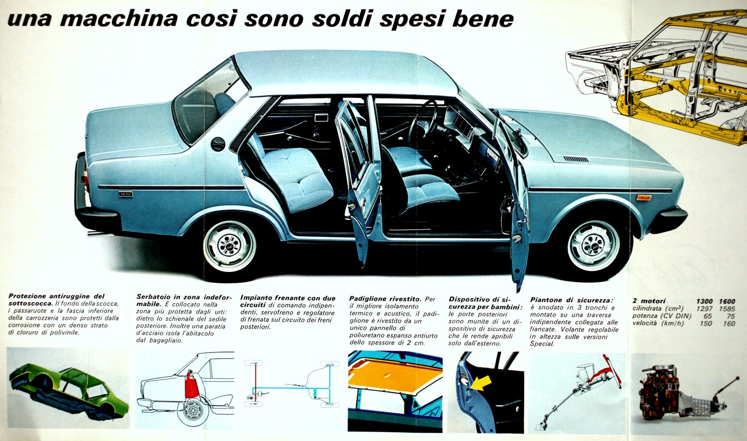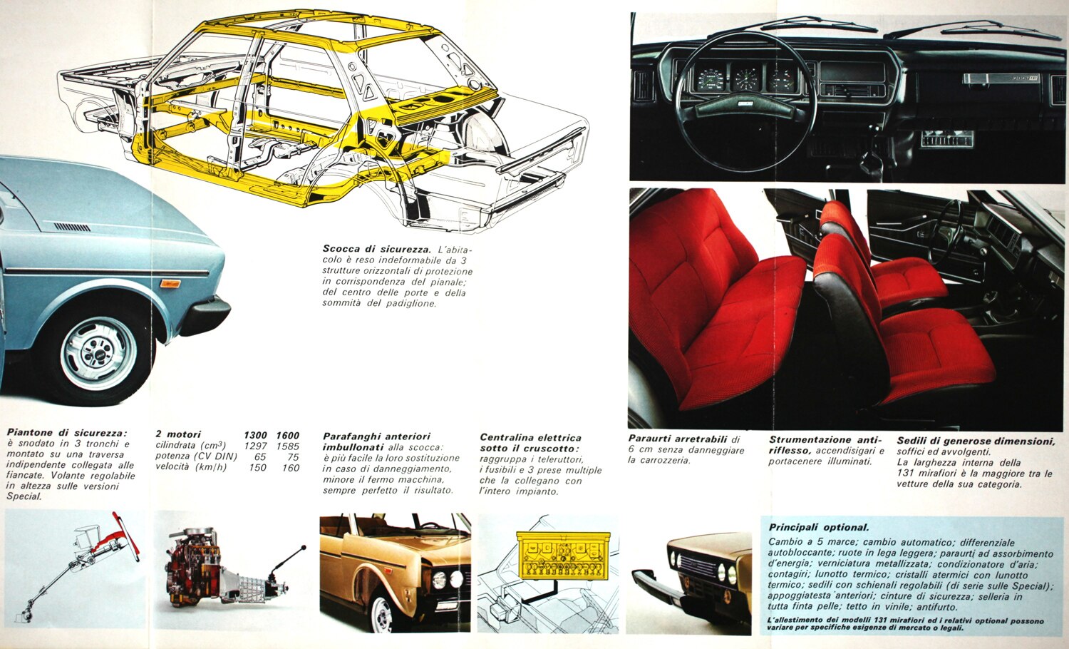 Alla rincorsa. Sulla 131 Mirafiori, classe 1974, per la prima e ultima volta una Fiat ha una denominazione doppia, che associa la solita cifra (il codice interno di progettazione) a un nome, in questo caso quello di uno dei due stabilimenti in cui viene costruita (l’altro è quello laziale di Cassino). Come la Taunus - e non è certo un caso - è disponibile, per la prima volta nella storia delle medie torinesi, con carrozzeria a due porte, che la fa assomigliare un po’ a una coupé (variante peraltro mai realizzata), e che sarà apprezzata più all’estero che in patria. Altro inedito: mai, prima di allora, una Fiat era stata presentata, sin dal debutto, in ben 11 versioni, combinando carrozzerie, allestimenti (normale e Special, molto diversi tra loro) e motori. Che sono, guarda caso, due, con cilindrate identiche (1.3 e 1.6 litri) a quelli della Taunus e potenze non dissimili (rispettivamente, 65 e 75 CV), pur essendo più tradizionali: sono infatti degli aste e bilancieri derivati - come del resto la meccanica - dalla precedente 124. Rispetto alla quale la 131 Mirafiori va tuttavia al risparmio sui freni: ha infatti i dischi solo davanti, invece che sulle quattro ruote.