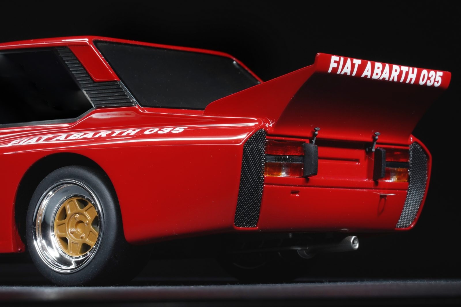 Esteticamente, oltre al rosso lucido, l'occhio cade sulla muscolatura del modello: passaruota allargati, carreggiate generose, spoiler anteriore pronunciato e un alettone posteriore XXL. Il frontale offre una precisa ricostruzione della calandra nera con al centro la scritta “Fiat Abarth” ben leggibile tra le coppie di fari realizzate, come sempre, con buona trasparenza. Il cofano evidenzia, attraverso dettagli come prese d'aria e ganci di chiusura, l'indole sportiva senza compromessi. Osservando il modello lateralmente è impossibile non soffermarsi sui particolari cerchi e pneumatici bicolore, il tutto ben misurato per replicare l'assetto piantato e aggressivo dell'esemplare reale.
