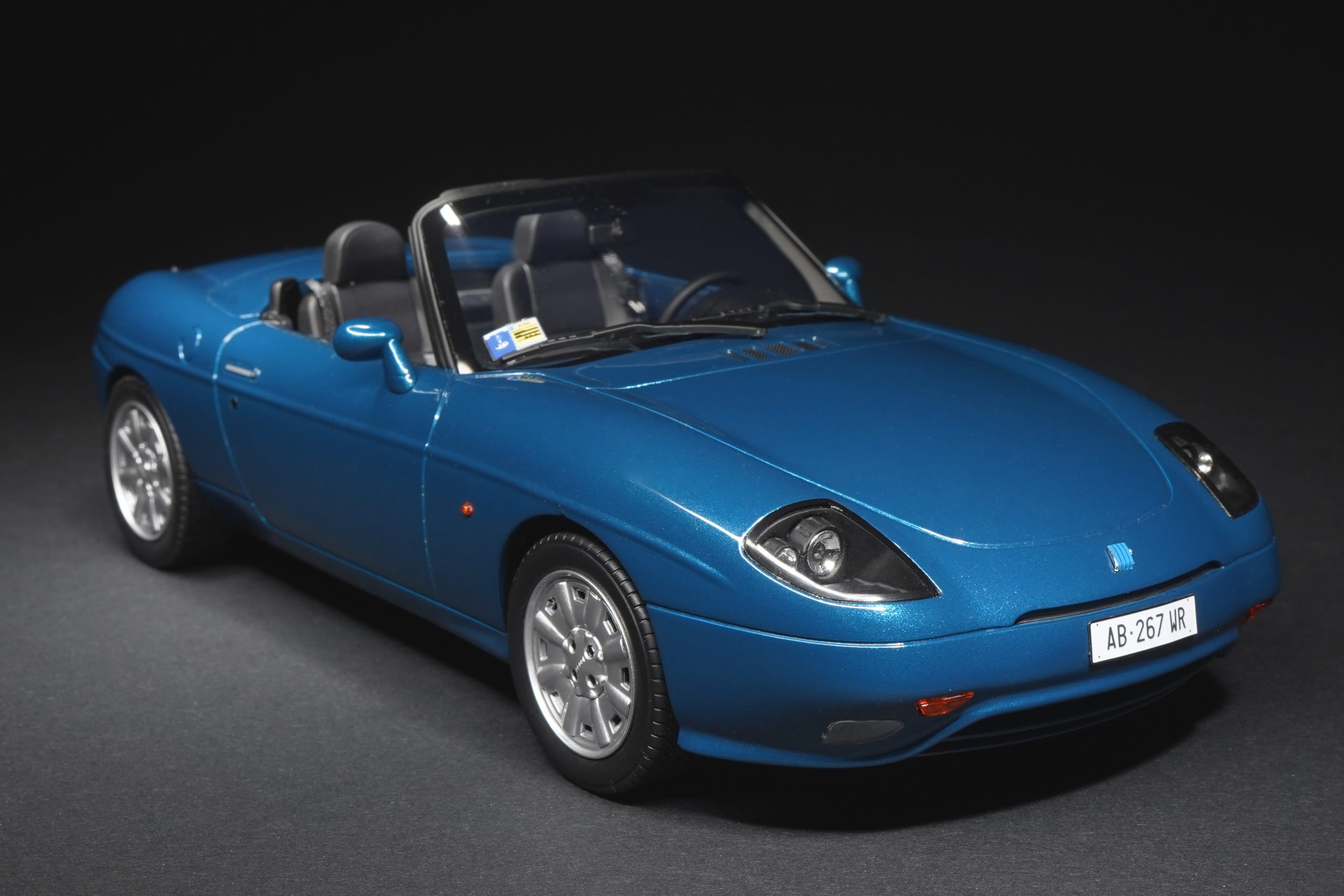 Il frontale, con i fari carenati e lo scudetto Fiat ridotto a un accento grafico sul cofano, è riprodotto con notevole pulizia. Bello il blu metallizzato, molto fine, che cattura bene la forma tondeggiante della carrozzeria. Il posteriore è cortissimo e raccolto e ottime sono le luci, separate e ben definite. Convince il doppio terminale cromato e risulta pulito il logo “barchetta” realizzato in rilievo. Anche la targa è quella giusta per l’epoca. Precisi i cerchi, dalla verniciatura uniforme, e gli pneumatici in gomma morbida che riportano la spalla con la corretta altezza. Convincente l’equilibrio generale, confrontandola con un esemplare reale, messo a disposizione da Michele Gallingani.