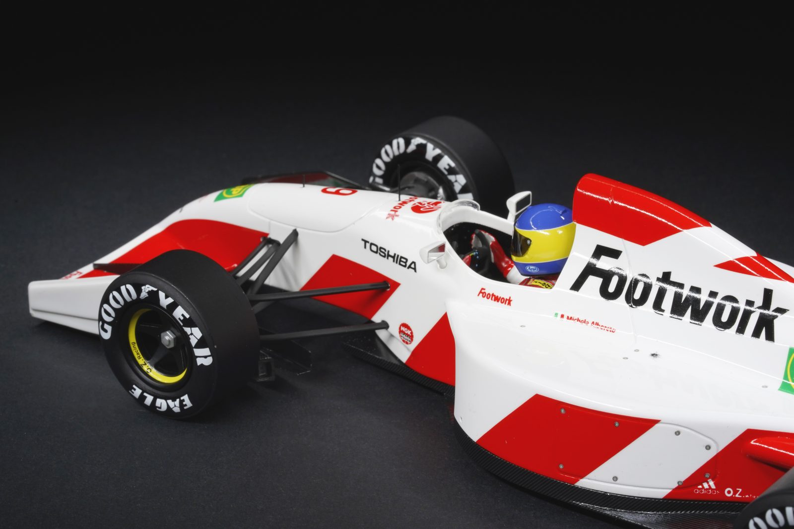 La carrozzeria, di resina, è rifinita con una verniciatura dove il bianco domina e il rosso spezza con linee diagonali il profilo, una grafica che ricorda le fettucce dei lavori in corso. Le decal sono sottili e perfettamente posizionate: i loghi Footwork sui lati e i pochi sponsor come Toshiba e BP sono ben centrati e simmetrici. L’aerodinamica è riprodotta con attenzione: il muso sottile con l’ala anteriore integrata e le derive laterali sintetizzano la filosofia della scuderia britannica di quegli anni. L’insieme è armonizzato da linee morbide senza eccessi spigolosi, tipici di modelli meno curati. Il posteriore merita un approfondimento: l’ala finissima sui lati e la scritta Toshiba sono proporzionate e, nonostante gli spessori minimi, l'alettone risulta assemblato in maniera solida. La zona del diffusore e del fondo vettura evidenziano una piacevole texture carbon look. I pneumatici Goodyear, con la scritta in bianco ben marcata, hanno una finitura opaca convincente e una spalla correttamente ricreata, ricreando l’assetto reale della monoposto che risulta così credibile.