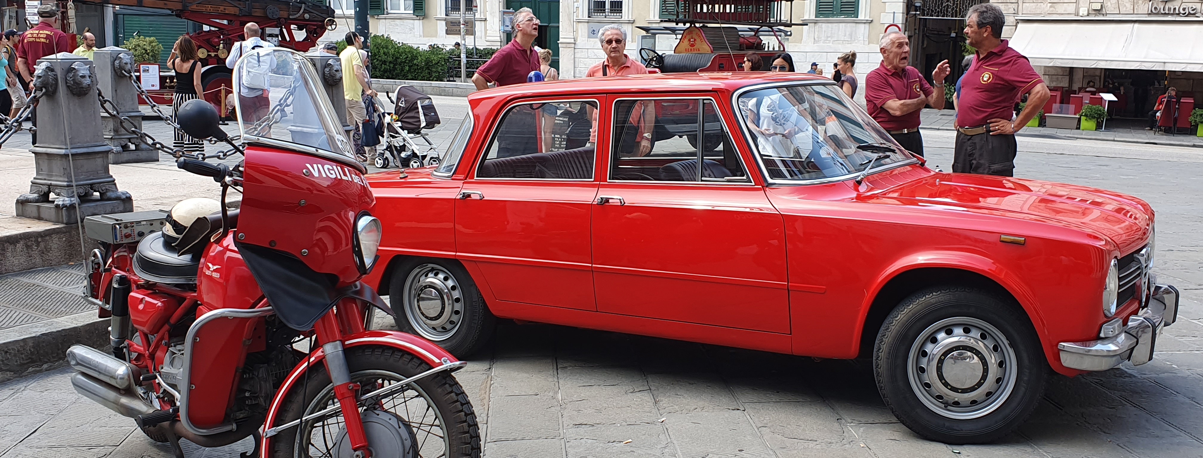 Passeggiando per la piazza centrale di Genova, tra De Ferrari e Il Teatro Carlo Felice, il rosso che colpisce non è quello delle allerte meteo o del caldo agostano, bensì quello dei Vigili del Fuoco. Si respira aria di tradizione e di soccorso del tempo che fu,conautopompe del 1916 come la Fiat 15 Ter, veicolo del 1916 con un quattro cilindri, 40 cavalli e un motore che messo in moto pulsa come oggi non sanno più fare neppure quelli da competizione. Si guidava "scoperta", e dietro la panchina e il volantone c’è lo storico logo "Pompieri Civici di Genova" con la bandiera di San Giorgio del capoluogo ligure. L'esposizioneè al centro di una delle giornate previste nel calendario dei festeggiamenti per l’ottantesimo anniversario della fondazione del Corpo Nazionale dei Vigili del Fuoco.