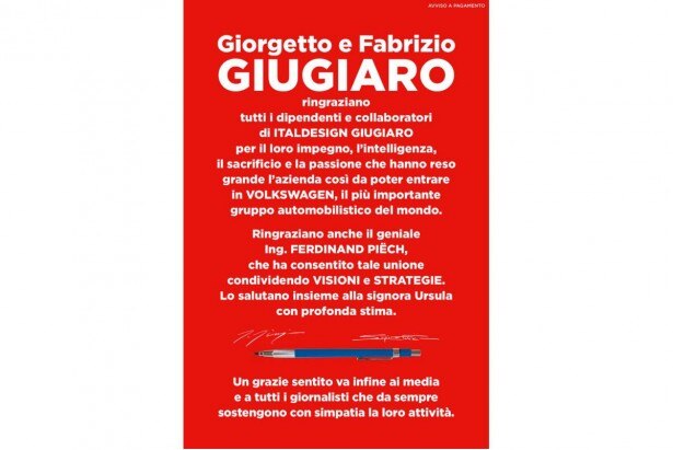 Sedici giorni dopo il clamoroso annuncio delle dimissioni da presidente onorario della Italdesign e della di cessione alla Volkswagen della propria quota e di quella del figlio Fabrizio (vedi articolo) Giorgetto Giugiaro si toglie il primo sassolino dalla scarpa e pubblica su tutti i principali giornali italiano un ringraziamento dal sapore polemico. Ringrazia dipendenti e collaboratori, media e giornalisti che lo hanno sempre sostenuto, ma, in particolare, ringrazia con grande rilievo “il geniale Ing. Ferdinand Piëch” e la moglie Ursula, che hanno consentito alla Italdesign Giugiaro di entrare in Volkswagen, “il più importante gruppo automobilistico del mondo”.