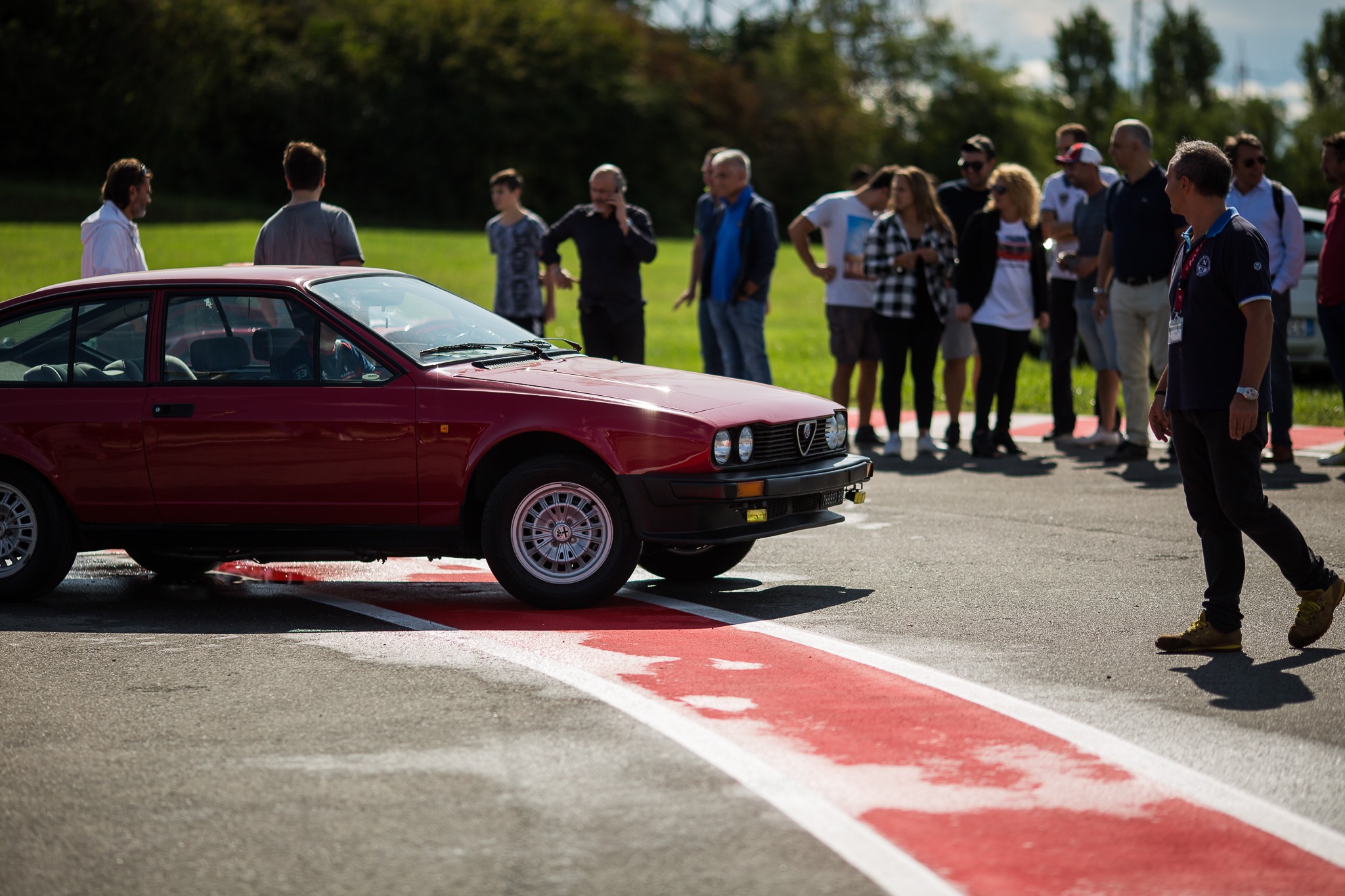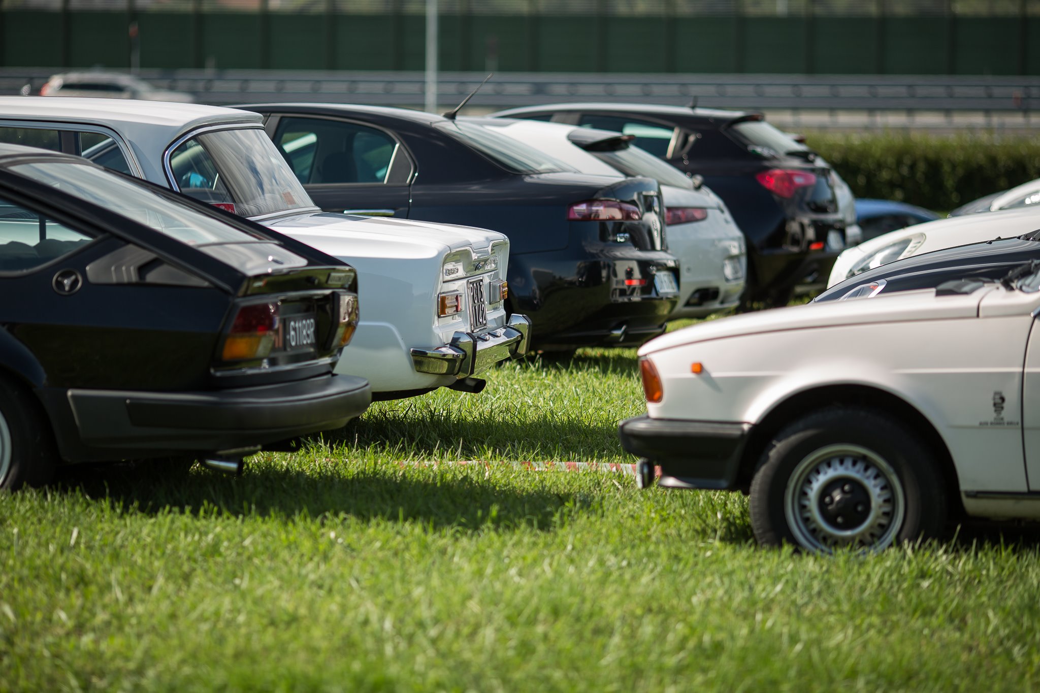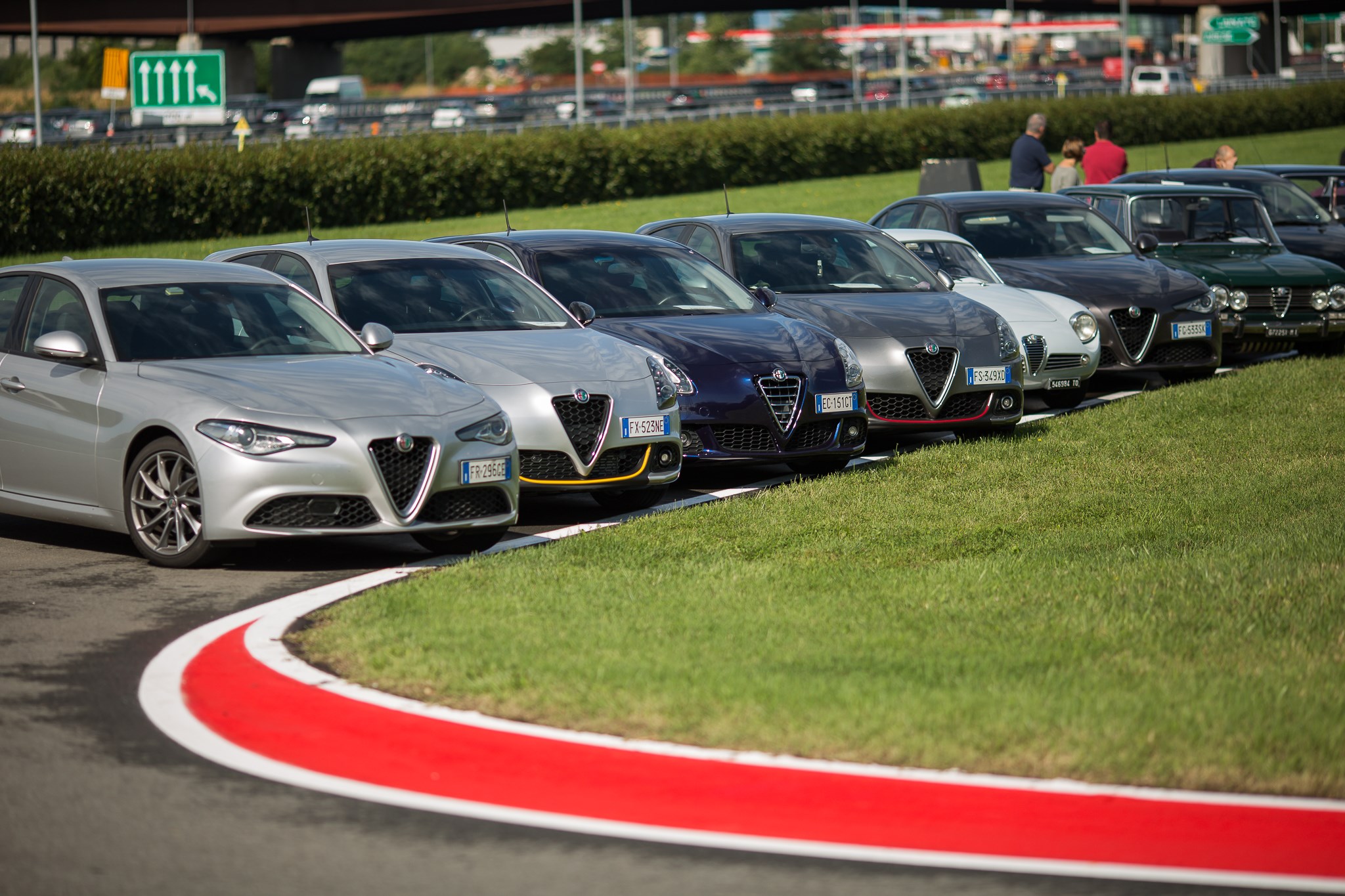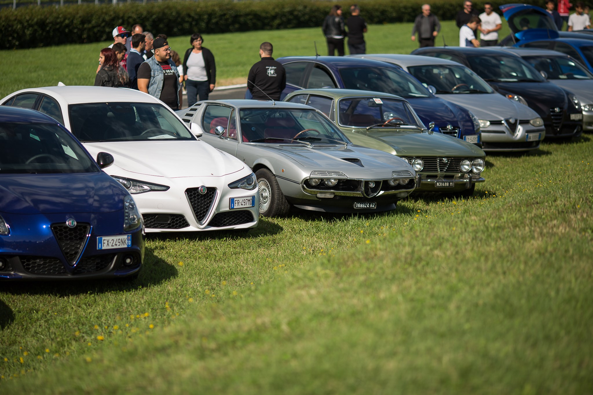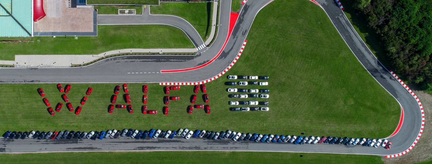 W Alfa! Un esercito di Alfa Romeo storiche, youngtimer e moderne ha pacificamente invaso l’asfalto e il prato del pistino del Museo Storico. Molte erano rosse, alcune bianche e altre nere, ma erano benvenute Alfa di ogni colore. Sul prato che separa i due tratti rettilinei della pista e che si affaccia sull’autostrada dei Laghi, le vetture rosse si sono disposte per comporre la scritta “W ALFA”, mentre le bianche e le nere hanno formato una bandiera a scacchi.