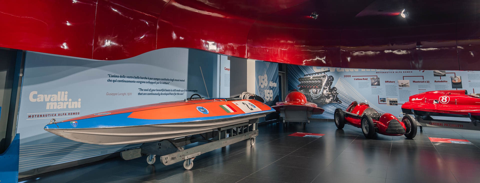 Natanti da record. Ma accendiamo i riflettori sugli scafi, perché da sole, nove delle dieci imbarcazioni esposte hanno collezionato undici record del mondo, sei campionati mondiali, sette europei e nove italiani. Oltre a cinque medaglie d’oro del Coni. La competitività dei motori Alfa era così elevata anche perché questi, modificati in versione marina, erano spesso gestiti sui campi di gara direttamente dal reparto corse della Casa. E affidati in esclusiva a scuderie e concorrenti solo per un ciclo di competizioni.