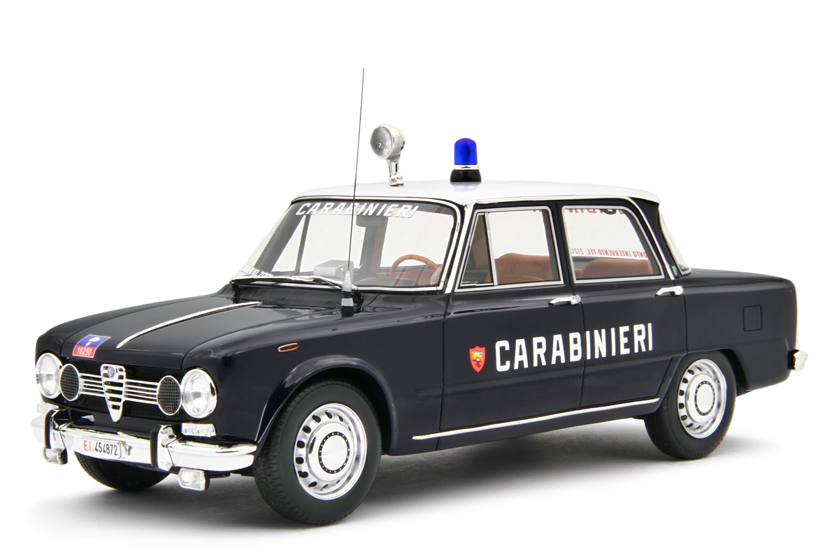 La Giulia dei Carabinieri si presenta in verde con targa “EI”, antenna radio posizionata sul cofano anteriore, lampeggiante centrale sul tetto e grafiche su parabrezza e lunotto. Il segno più distintivo è la calandra, che non presenta i quattro classici fari ma solamente i due esterni, con quelli interni sostituiti dalle griglie. Su queste versioni non erano presenti scritte sulle fiancate, mentre sul cofano e sul baule spiccano, nelle decalcomanie rosse e blu, lo stemma della fiamma e il codice identificativo. La seconda livrea racconta l’evoluzione della Benemerita, questa volta in abito blu scuro: sulle fiancate si aggiunge la scritta “Carabinieri” e il logo in rosso, il tetto invece è bianco e ospita, nella parte posteriore, il numero dell’auto e, in quella anteriore, un faro aggiuntivo. Gli interni vedono dettagli come la radio e la paletta posizionata nell’interno della portiera.