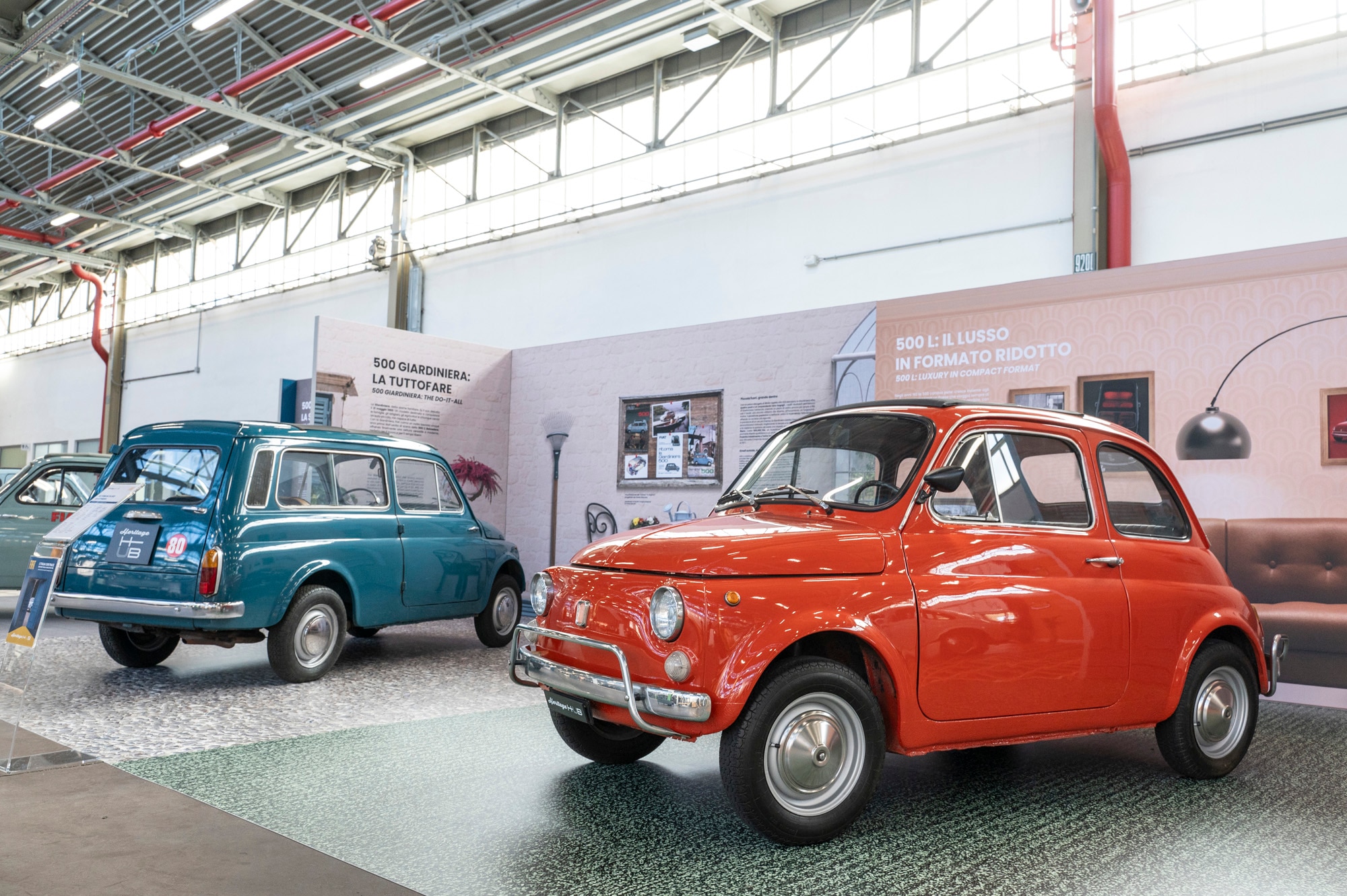 Esposti dieci modelli – non tutte le versioni, ma le più significative – dalla 500 N degli esordi alla nuovissima Hybrid Torino, così chiamata perché prodotta nel capoluogo piemontese. Fra i due estremi temporali, si possono ammirare la versione Abarth del 1958, che conquistò sei record internazionali di velocità e di durata, la 500 Giardiniera, qui esposta nella successiva variante marchiata Autobianchi, che grazie al motore orizzontale “a sogliola” garantiva buone capacità di carico, la 500 L, la più vezzosa della stirpe, e la 500 R, ultima serie prodotta fino al 1975 e dotata del motore della 126. Seguono la Trepiùno del 2004, concept car che ha prefigurato la riedizione della 500 lanciata nel 2007, anch’essa presente, poi la Abarth del 2008 e la 500e del 2020, prima versione elettrica. Ogni modello dalla 500 N in qua è ambientato in una scenografia che riproduce una stanza di una casa italiana, così come poteva apparire negli anni di quella versione, con le suppellettili del tempo: si passa così dalla radio a valvole e dai telefoni a muro ai televisori a comando manuale e ai mobili lineari degli anni 70, fino ad arrivare agli schermi piatti e ai computer dei giorni nostri.