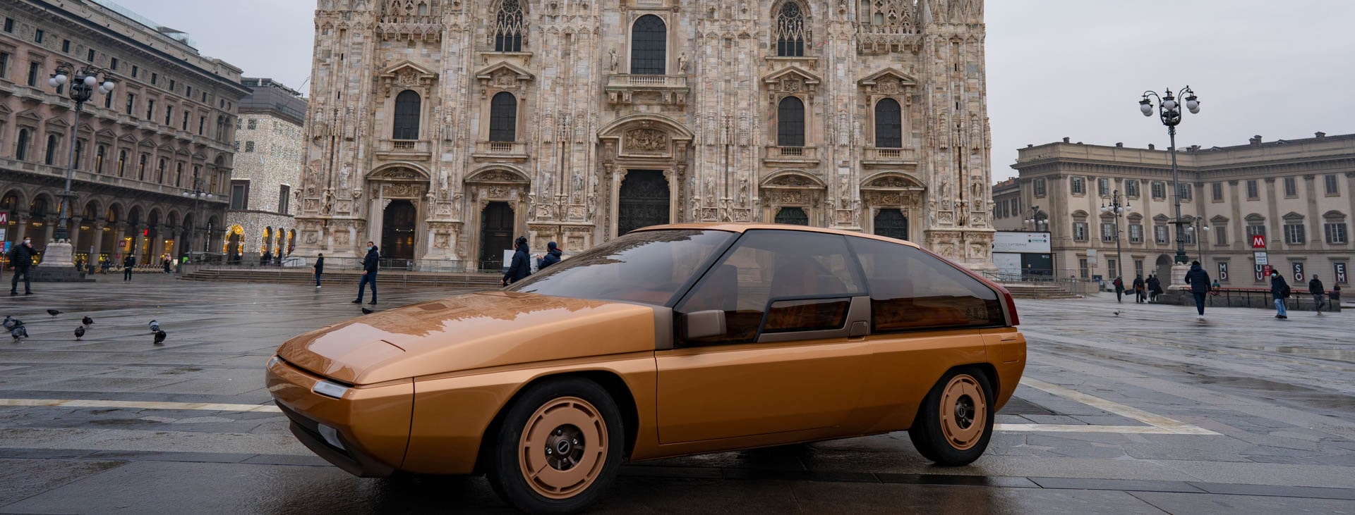 Stupore a Tokyo, ritratto a Milano. Con la vernice dorata, le superfici vetrate a piena luce e i fari a scomparsa, la MX-81 fece colpo al Motor Show di Tokyo. Il bello però arrivava una volta aperta la portiera. Il design degli interni, con il volante rettangolare incassato, il cockpit a forma di schermo TV, i comandi squadrati come gli scarichi e i sedili anteriori oscillanti, in pelle e tessuto a rombi, spingevano la MX-81 Aria avanti di anni… luce. Tant’è che fu scelto di fotografarla ufficialmente anche in piazza Duomo a Milano, già allora riconosciuta come una delle capitali del design internazionale. La concept era una dichiarazione di intenti e una sfida alle convenzioni tipica dei modelli MX. Alcuni elementi, come i fanali posteriori montati in alto e i fari a scomparsa, apparvero sulle future Mazda di serie negli anni Ottanta.