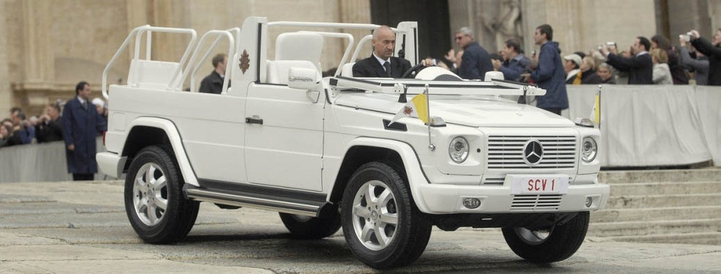 Un’amicizia di lunga data. La Mercedes-Benz 230 G “Papamobile” del 1980 fa parte di una lunga lista di vetture Mercedes-Benz in uso presso il Vaticano. L'inizio di questo sodalizio risale a 90 anni fa, nel 1930, con la Mercedes-Benz Typ 460 Nürburg (W08), realizzata dal reparto “Sonderkarrosserie” (Carrozzerie Speciali), di Sindelfingen. Nel 1960 fu la volta della Mercedes-Benz 300 Landaulet (W 189) e nel 1965 venne donata l’imponente Mercedes-Benz 600 Pullman Landaulet (W 100). A queste vetture sono seguiti altri modelli, da versioni a tetto apribile delle varie Classe S alla Classe M. Tuttavia nessun’altra vettura quanto le 230 G e GE incarna l’immagine della Papamobile nell’ immaginario collettivo: tanto che nel 2007 durante il pontificato di Papa Benedetto XVI una nuova Classe G entra nei garage vaticani; si tratta di una speciale G500 Guard della serie W463 utilizzabile con o senza copertura trasparente.