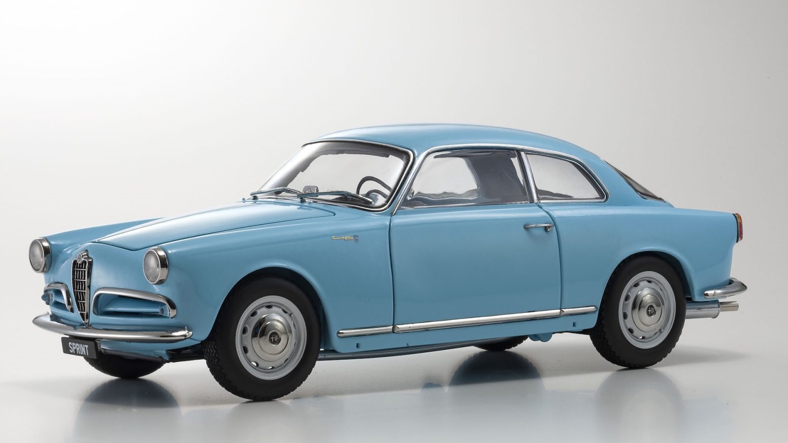 Sollevare il cofano anteriore è come alzare il sipario su un piccolo palcoscenico meccanico: all'interno troviamo il cuore della "Sprint" replicato con un buon livello di dettaglio. Le candele sono collegate da minuscoli cavetti e si possono seguire fino alla calotta spinterogeno; una chicca il tappo del radiatore. Per ultimo il baule posteriore che, sollevato, offre la vista della ruota di scorta. La si trova (ancora) attorno ai 250 euro, prezzo destinato a salire un po' come per tutte le Kyosho. Un modellino da collezionisti, che racconta una delle stagioni più felici del design italiano.