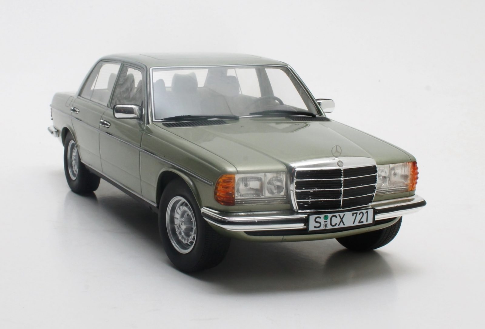 La linea della 280E W123 è armoniosa e trasmette un’immediata sensazione di robustezza ed eleganza. Il frontale è il dettaglio più riconoscibile, con la classica calandra cromata, i fari rettangolari e gli indicatori di direzione arancioni: tutto riprodotto con estrema fedeltà.