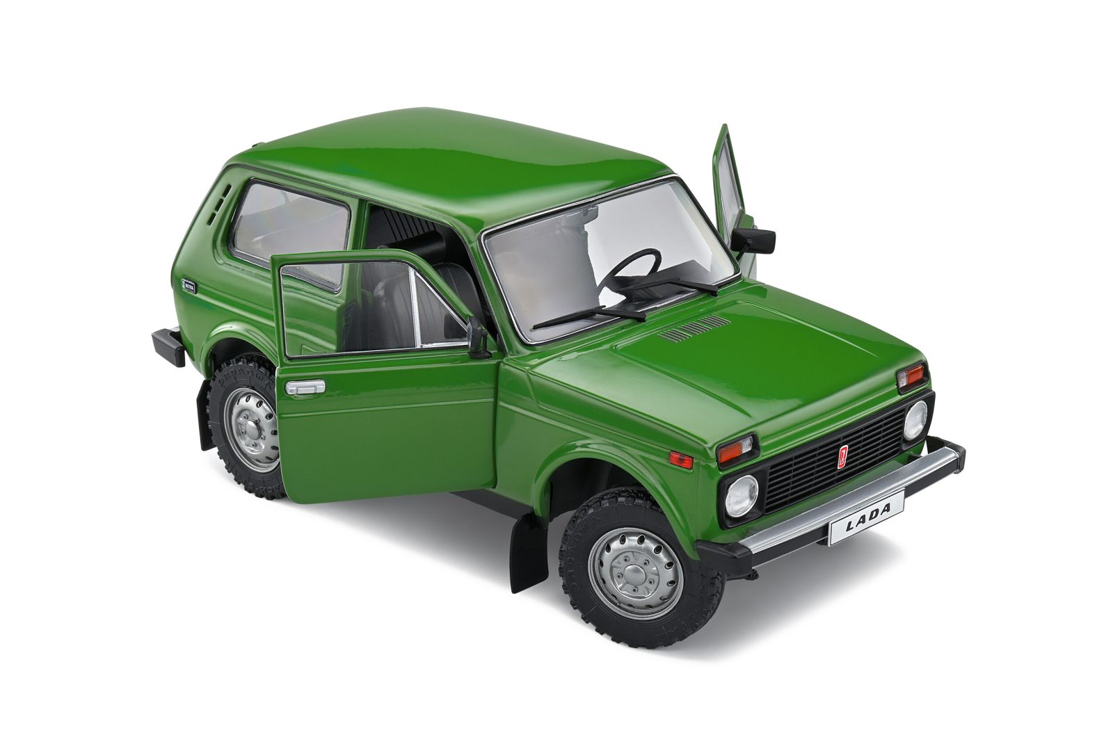 La linea di questa Lada Niva in scala 1:18 della Solido convince subito: passo corto e assetto sono corretti e la verniciatura è ben applicata, sia per quanto riguarda la carrozzeria sia per i cerchi. Nonostante la semplicità stilistica di quest’auto, troviamo dettagli interessanti, come i paraspruzzi anteriori e posteriori e il gancio traino (raro nei modelli in scala).