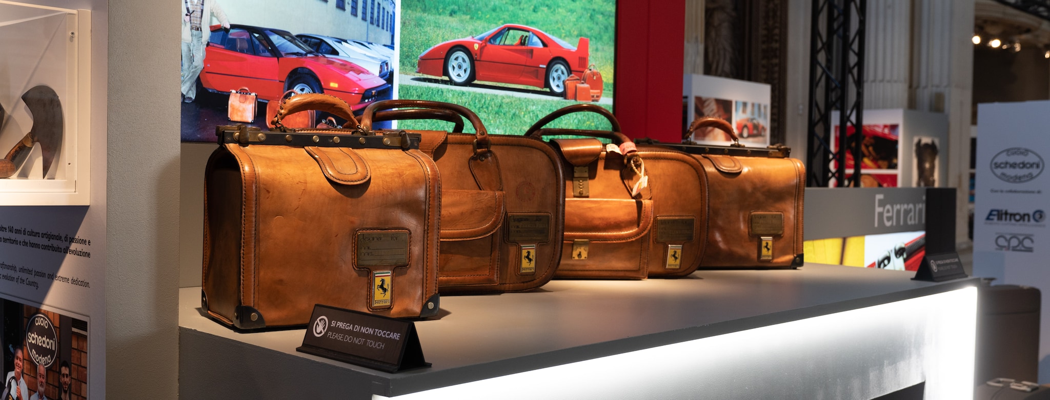 Eccellenza italiana. Entrando -gratuitamente- verrete subito sopraffatti da un’atmosfera originale e avrete la possibilità d’osservare da vicino alcuni dei set di valigie pensate per essere sfoggiate a bordo di prestigiose supercar. Un orgoglio italiano (Schedoni) richiesto dai brand più prestigiosi al mondo, come Ferrari, Lamborghini e Pagani. Nel corposo elenco delle collaborazioni, tra i prodotti visibili, potrete fotografare anche le ricercate proposte realizzate per Bentley, Aston Martin e Bugatti. Oltre all’innovazione anche la tradizione, con la presenza di pezzi racing d’eccellenza legati alla storia dell’azienda: su tutti, la copertura dei sedili usati dalla monoposto di Michael Schumacher.
