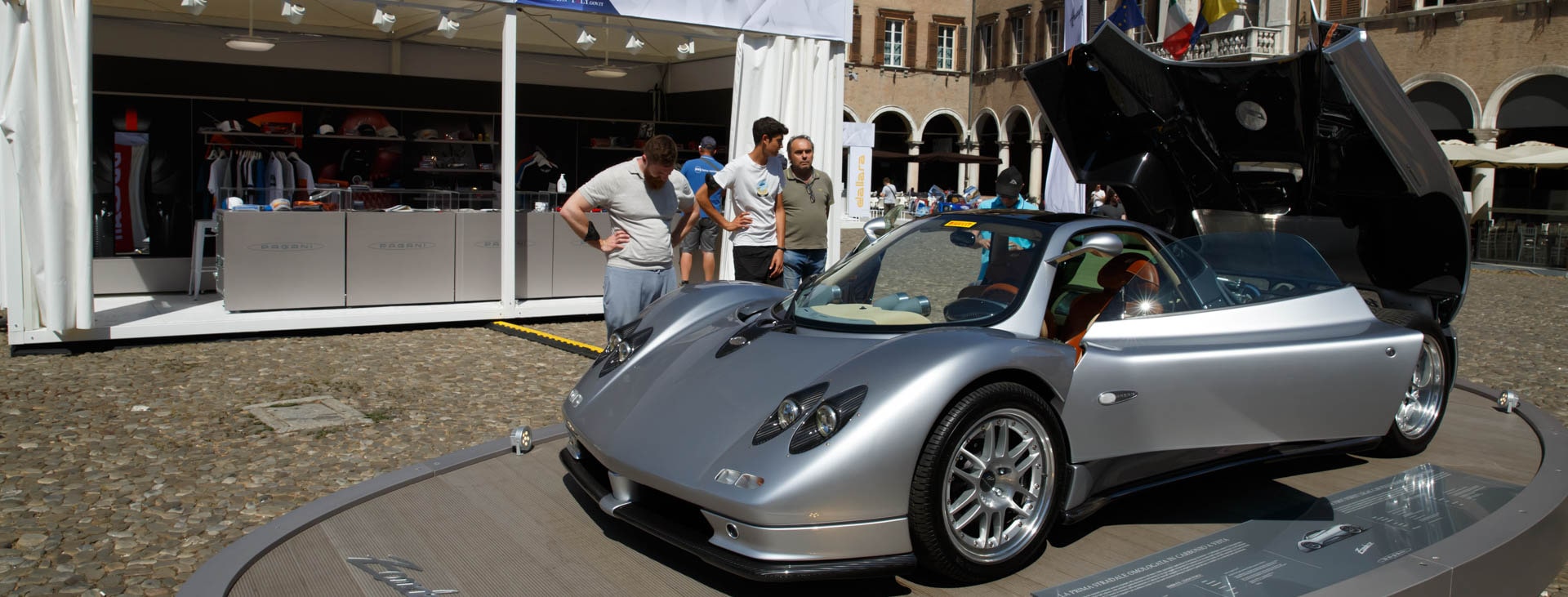 Sotto il cielo terso di un pomeriggio assolato, le carrozzerie delle più ambite tra le auto da sogno hanno lucentezza particolare. Tra gli sguardi ammirati dei passanti, l’entusiasmo è palpabile, a maggior ragione in periodo come questo, sembra quasi di tornare a rivivere un weekend motoristico del periodo pre-Covid. Giunti in Piazza Grande lo stand Dallara espone due vetture da competizione della Dallara Academy, tra cui la P217 ELMS e una monoposto Formula. Poco più avanti, all’ombra del Duomo troviamo schierato il lineup composto dalle serie speciali della seconda hypercar sviluppata da Horacio Pagani nel 2011. Ecco quindi la Huayra BC, la Roadster BC, la Imola e la Tricolore. Al centro della piazza, la Zonda C12S, il primo esemplare della Casa di San Cesario sul Panaro.