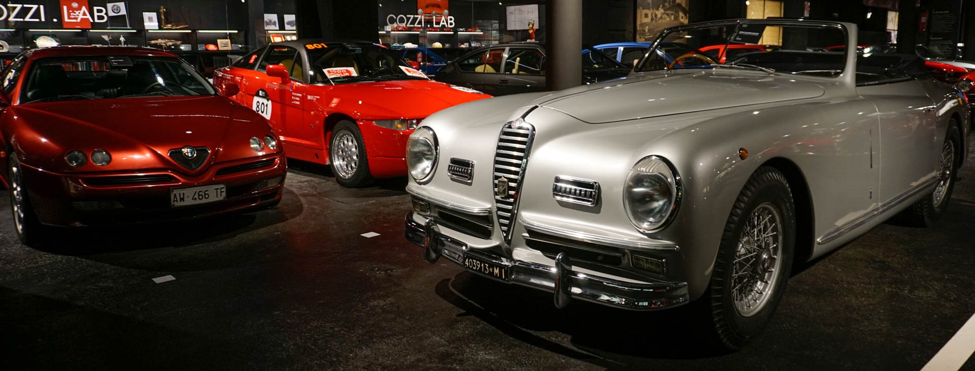 Più uniche che rare. La rassegna inizia con una vettura molto speciale, l’Alfa Romeo 6C 2500 Freccia d’Oro in arte “Gobbone”, la vettura che sancisce la fine della produzione artigianale Alfa Romeo a cavallo della Seconda Guerra Mondiale e del Dopoguerra, una delle ultime vetture italiane con guida a destra. Passiamo quindi all’ Alfa Romeo 1900 Super, che segna l’avvento della produzione in serie e alla Giulietta TI, un esemplare “Giallo Cina”, che è stata la prima vettura ad entrare nella collezione di Pietro Cozzi. C’è poi la magnifica 6C Cabriolet Farina, datata 1950 come la coupé Freccia d’Oro e la Giulia TI, un esemplare unico in grigio “Fumo di Londra”. Ogni auto ha una storia particolare e vale davvero la pena di visitare il Museo per scoprire tanti aneddoti e curiosità come quello relativo alle 50 Alfa Romeo 1750 donate nel 1970 al governo cubano o al record tuttora imbattuto dall’altro esemplare unico della collezione, la 155 Q4 che nel 1992 battè il record di velocità sul lago salato di Bonneville.