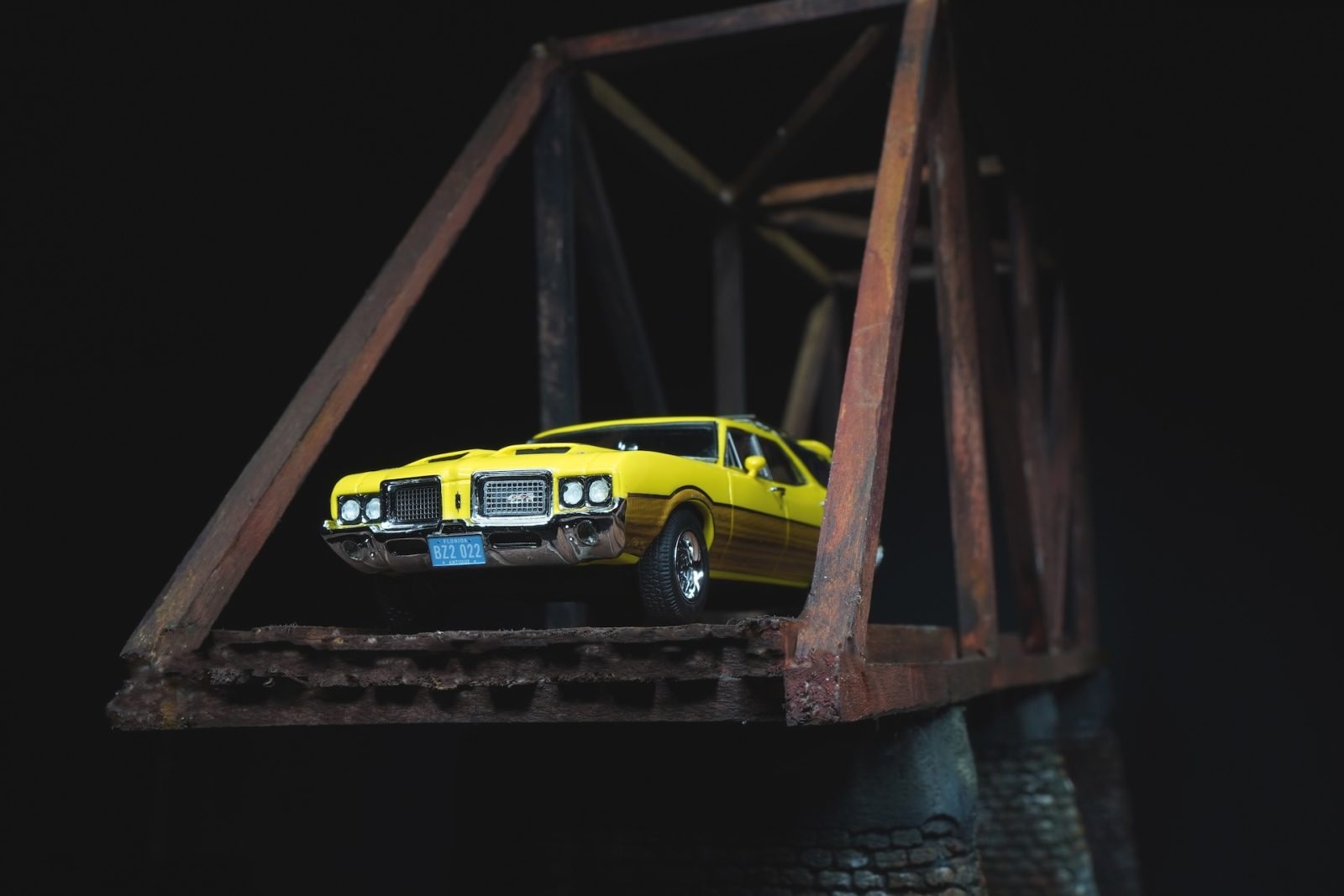Inconfondibile con le sue fiancate rivestite da listelli di legno e il tetto panoramico, l’Oldsmobile Vista Cruiser 442 SW del 1972 è una delle wagon più rappresentative dell’epoca. La ditta Kess la propone in scala 1:43 in una versione verde acido, corredata da cromature, portapacchi e tre file di sedili per un abitacolo luminoso e arioso. Per valorizzarla, Fabrizio Ferrari ha realizzato un diorama ispirato ai classici ponti di legno dei paesi americani degli anni 70.