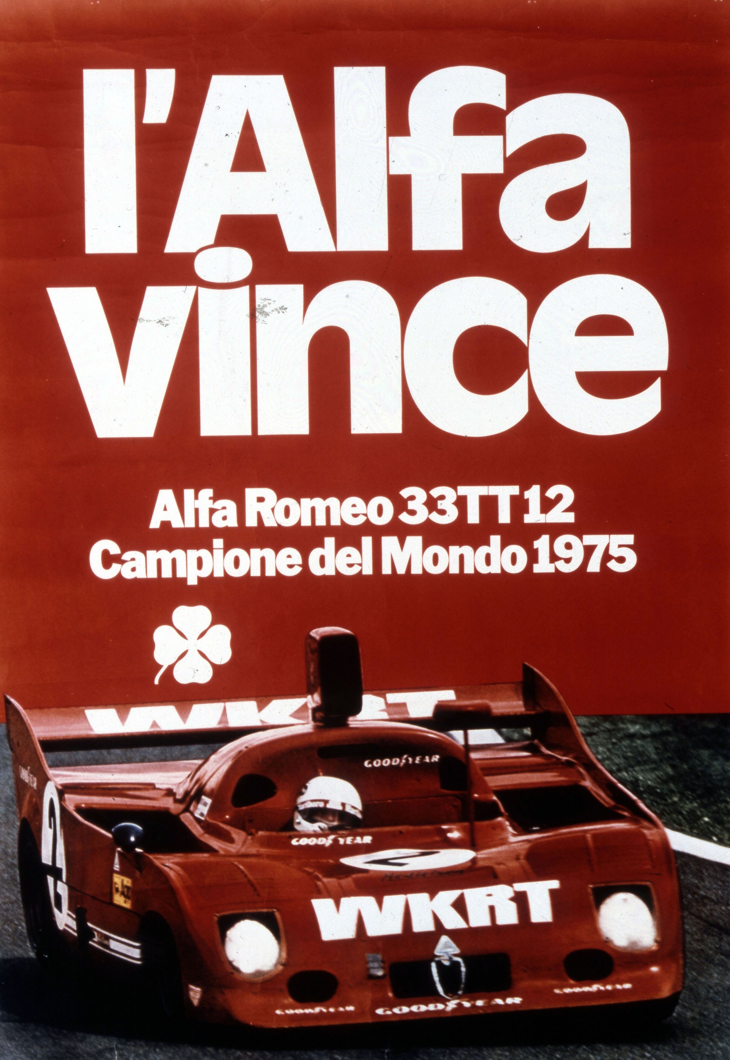 Alfa Romeo 33 TT 12(1975). La 33 TT 12 debutta il 5 maggio 1973 alla “1000 Km di Spa-Francorhamps”, quando il Campionato Mondiale Marche sta vivendo il suo massimo momento di popolarità. La denominazione "33", portata al debutto nel 1967, è ormai divenuta leggenda; la sigla “TT” significa “Telaio Tubolare” (derivato dalla precedente 33 TT3 con motore 8 cilindri a V) e “12” indica il numero dei cilindri dell'inedito propulsore boxer di tre litri in grado di superare la soglia dei 500 CV e di spingere la vettura fino alla velocità di 330 km/h. A “Passione Alfa Romeo” sarà guidata da Arturo Merzario, che a bordo della TT12 conquistò il Campionato Mondiale Marche nel 1975.