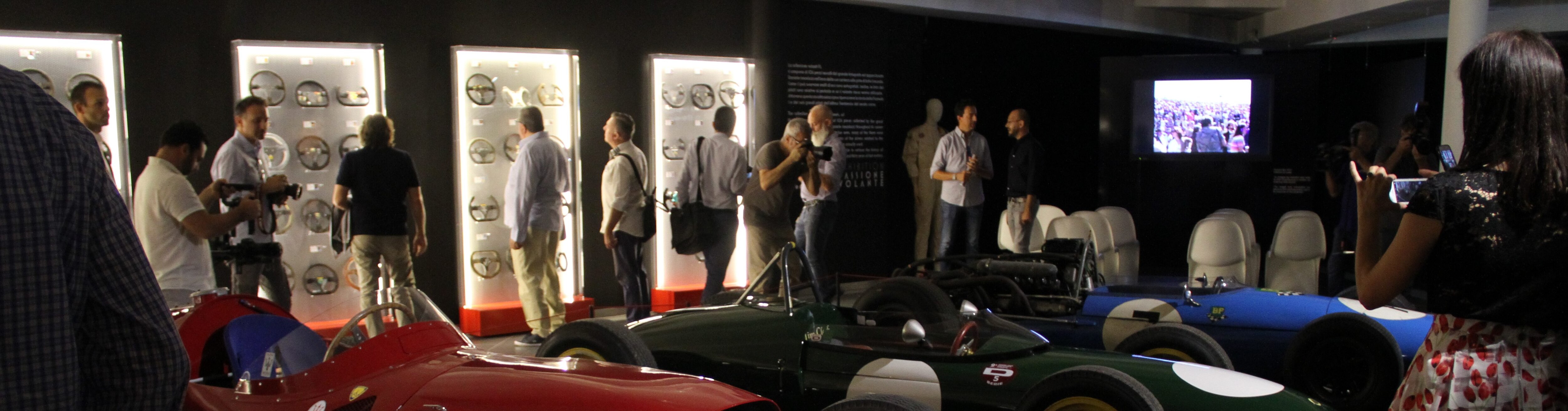 I volanti dei campioni. Introdotta dal giornalista e scrittore Leo Turrini, questa mostra, in particolare, ha lo scopo di cogliere, se non di scoprire, la funzione del volante, come connessione imprescindibile (forse ancora per poco, ahimè) tra il mezzo meccanico e le mani, quindi le braccia, il cuore e il cervello di chi guida. Cuore della mostra è l’unica e inedita collezione di volanti di Formula 1, raccolti dal fotografo Daniele Amaduzzi nell’arco di 20 e più anni frequentando i campi di gara, e, nella maggior parte dei casi, autografati dai piloti che li hanno stretti tante volte tra le mani. Oltre 100 pezzi appartenenti a uno dei periodi più interessanti della storia della massima competizione automobilistica, quello tra il 1970 e il 1999, che ha visto succedersi, alla guida di mitiche monoposto Ferrari, McLaren, Lotus, Williams, Benetton e tante altre, campioni entrati nel cuore degli appassionati, come Michael Schumacher, Ayrton Senna, Nigel Mansell, Alain Prost e Michele Alboreto, solo per citarne alcuni. In aggiunta, altri 30 volanti granturismo utilizzati tra gli anni 20 e gli anni 60.