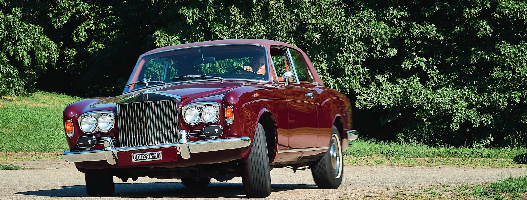 La nostra regina. Ma torniamo alla “nostra” Rolls-Royce Corniche Two Door Saloon, identificata dal telaio CRX14725 e costruita nel settembre 1972 su commissione dello storico concessionario Garage de L’Athénée, presente a Ginevra fin dagli anni Trenta. La macchina viene ordinata per essere esposta nell’esclusivo showroom ginevrino, probabilmente in vista di un’eventuale presentazione al prestigioso Salone motoristico che si svolge annualmente a marzo nella città elvetica. Tra gli accessori vengono specificati i vetri Sundym, la previsione per il montaggio dei poggiatesta anteriori (fatti poi realizzare con la stessa pelle dei sedili da un artigiano), il legno con gli inserti di tonalità diversa, lo “Scotchbrite Finish” ovvero la parte in pelle nera raggrinzata attorno a tutti i posacenere, i fari speciali Marchal al quarzo e le trombe pneumatiche Fiamm “Avanti GT” con il comando sul volante per i toni bassi (da città) ed a pedale per quelli alti (da viaggio in autostrada). Ma la vera peculiarità riguarda la livrea: la carrozzeria infatti è “Bayard Crimson” (una sorta di bordeaux con una tonalità di blu/viola), mentre il padiglione è rivestito in Everflex “Dark Red”; il sontuoso abitacolo è in pelle Connolly su campione “Pink Anela”. Secondo i registri della Rolls-Royce, questa è l’unica Corniche costruita con questo abbinamento, praticamente una fuoriserie a tutti gli effetti.