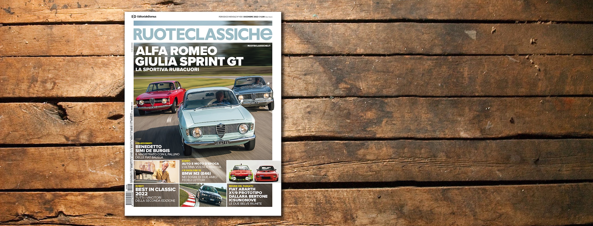 Tre Alfa Romeo Giulia: una Sprint GT, una GT“Lusso”e una GT Veloce rispettivamente bianca, grigia e rossa campeggiano sulla copertina di Ruoteclassiche di dicembre (6 euro). Tre declinazioni della sportiva simbolo di un'epoca che ha fatto innamorare milioni di italiani e fatto diventare alfisti alcuni di loro.