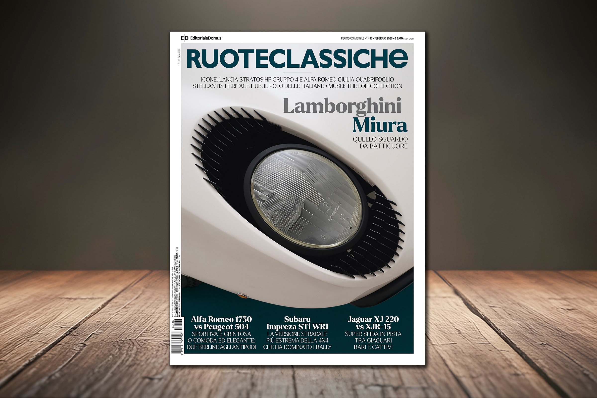 Ruoteclassiche di febbraio vi aspetta con tante protagoniste: Lamborghini P400 Miura, che tocca 60 primavere, Alfa Romeo 1750 vs Peugeot 504, Subaru Impreza STi WRX WR1, Jaguar XJR-15 vs XJ 220, Lancia Stratos HF Gruppo 4, la “senzatempo” Alfa Romeo Giulia Quadrifoglio e la restomod ErreErre Fuoriserie ForGiotto. Vi raccontiamo come andò con la Mercedes Classe A e il Test dell’alce e dello sponsor birraio in Formula 1. Abbiamo visitato per voi The Loh Collection e l’Heritage Hub di Stellantis. E molto altro ancora.