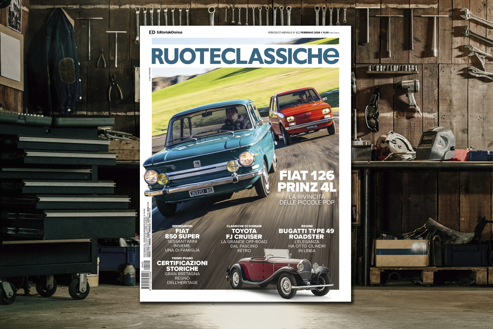 Arriva in edicola e in versione digitale , il 7 febbraio, il nuovo numero di Ruoteclassiche (6 euro), disponibile anche con il primo volume della nuova collana Icone, dedicato a utilitarie e compatte (Ruoteclassiche + Icone 11,90 euro). In copertina due piccole che oggi sono ricercate da parecchi fans, la Fiat 126 e la NSU Prinz 4L, entrambe a motore e trazione posteriore. Regina del numero di febbraio è una lussuosa e imponente Bugatti Type 49 Roadster, mentre come Classica di domani troviamo un'altra auto imponente, la Toyota FJ Cruiser. Ricordiamo poi i 70 anni della Mercedes 300 SL e vi facciamo scoprire l'Aurora Sport, barchetta da corsa su base Lancia, e la MG TD Vignale, un esemplare unico. Ci sono anche le Impressioni di una Fiat 850 Super, l'intervista al grande pubblicitario Jacques Séguéla, il restauratore Fabio Verin e le certificazioni storiche delle Case britanniche.