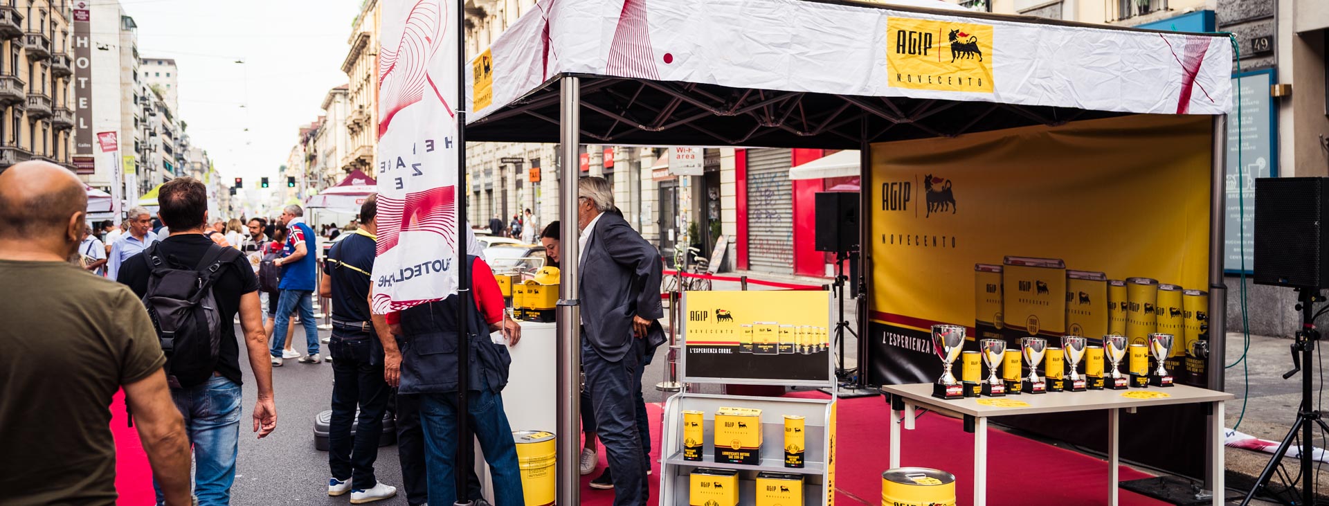 Workshop open air. Allineati come in una grande officina all'aria aperta, i lubrificanti di Agip Novecento accendono i riflettori sulla rinnovata linea di prodotti che il cane a sei zampe ha lanciato per le auto d'epoca. Lo stand espone diversi olii, sia per trasmissioni che per motori, oltre a liquidi specifici per la lubrificazione di svariati componenti meccanici.