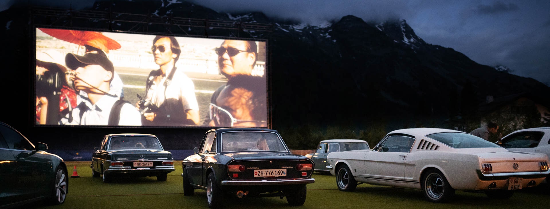 Andiamo al drive-in! Quella del drive-in è una tradizione nata negli Stati Uniti che tra gli anni 50 e 60 ha conosciuto un certo successo anche alle nostre latitudini: una trovata “licenziosa” per quei tempi, gradita soprattutto ai più giovani che potevano conciliare amori e motori. Il drive-in di St. Moritz nasce con un intento diverso, ovvero conciliare in tempi di distanziamento sociale la passione per i motori e quella per il cinema, due mondi spesso in sintonia.