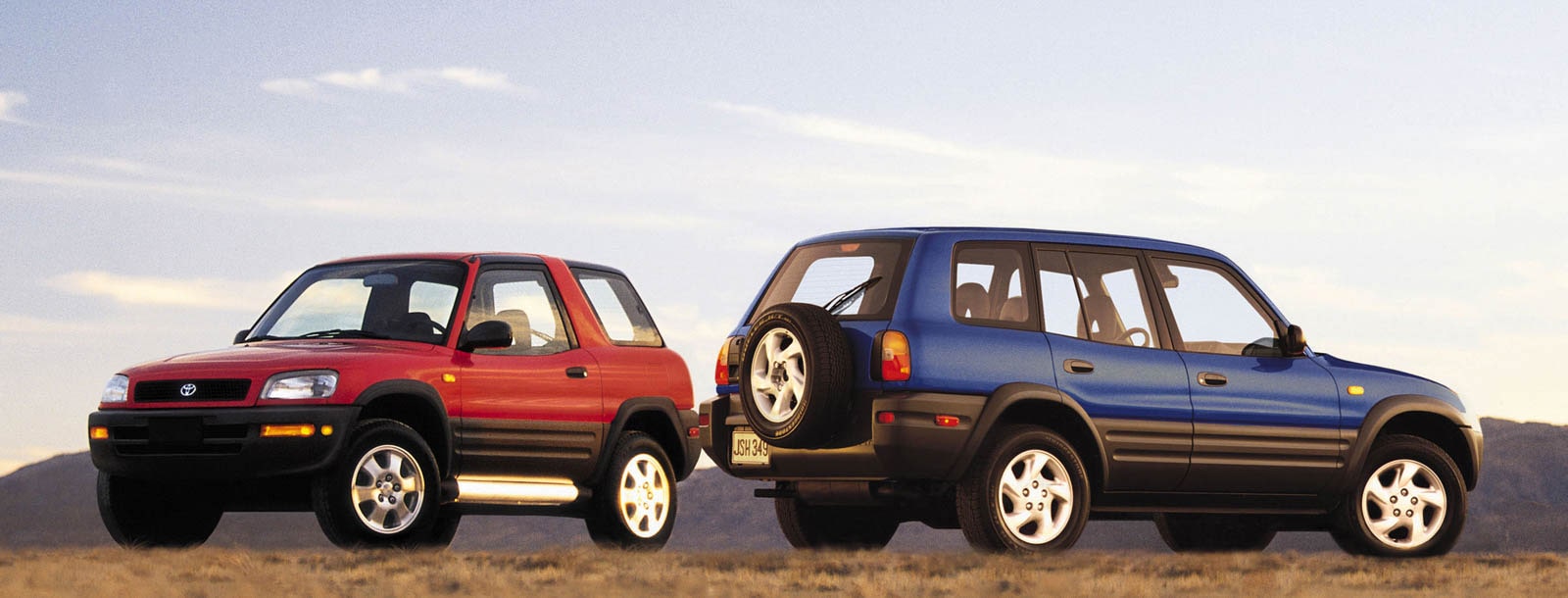 L’origine del mito. La RAV4 ha fatto il suo debutto nel 1994 come primo SUV urbano al mondo, pioniere di un nuovo segmento di mercato destinato a diventare centrale nel mondo automobilistico. Nella sua forma originale era un modello a tre porte con proporzioni compatte, lungo appena 3,69 metri. Il motore era un benzina da 2 litri e 129 CV, montato trasversalmente, mentre la trasmissione forniva una trazione integrale permanente, ma senza le marce ridotte, caratteristica che invece accomunava i fuoristrada duri e puri dell’epoca. Tra le altre innovazioni destinate a diffondersi c'erano anche il leggero telaio monoscocca e le sospensioni posteriori indipendenti. Le dimensioni compatte e la posizione di guida rialzata della RAV4 la rendevano facile da controllare, mentre la sua grande maneggevolezza e il comfort dei passeggeri erano più simili a una berlina che a un veicolo a trazione integrale. Nel 1996 la gamma venne ampliata per includere una versione a cinque porte (lunga 4,1 metri) e l'opzione della trazione anteriore a due ruote motrici. Seguì una versione soft-top a tre porte e, spingendo ancora una volta l'innovazione, tra il 1997 e il 2000 fu prodotto un modello EV a batteria in numero limitato.