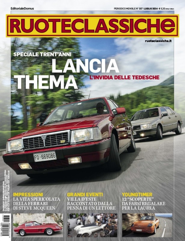 A trent'anni dal debutto, il numero di luglio di Ruoteclassiche, mette a confronto (e in copertina) due versioni immacolate della Lancia "Thema", ancora oggi nel cuore di tantissimi appassionati: la "Turbo" e la più recente "8.32". E accompagna il "Test a test" con un'agile storia in pillole del marchio di Chivasso, dalla "Dilambda" del 1927 al 1969, anno in cui la Lancia passò nell'orbita Fiat.