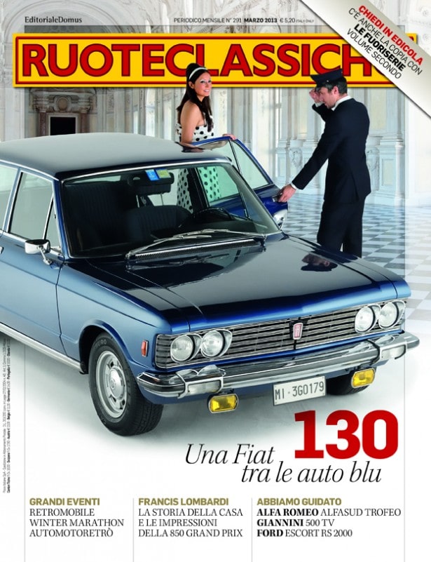 La 130, ultima vera ammiraglia di Casa Fiat, è la star di copertina del nuovo numero di Ruoteclassiche (foto Paolo Carlini), in edicola tra qualche giorno. A farle compagnia, all'interno della rivista, il reportage dai primi tre grandi eventi dell'anno - Retromobile di Parigi, Automotoretrò di Torino e Winter Marathon - ma anche la Porsche Boxster, protagonista del nostro spazio "Yougtimer" e la curiosa (e documentata) trasformazione di una Rover Mini Cooper in Morris Mini Cooper S Rally... La rassegna di questo mese è dedicata alla storia della Francis Lombardi, della quale riportiamo le impressioni di guida della 850 Grand Prix. Abbiamo inoltre provato l'Alfa Romeo Alfasud Trofeo che vinse il primo campionato nel 1976, la Giannini 500 TV" e la Ford "Escort RS 2000". Ricordiamo che il numero di marzo è in vendita, per chi lo desidera, anche con l'allegato "Le Fuoriserie", la cui seconda uscita prende in esame il bienni 1958-59.
