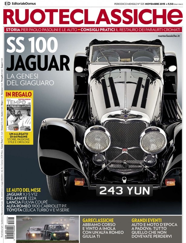 Un omaggio a un compleanno tondo - ottant'anni - sulla copertina di Ruoteclassiche di novembre, attraverso il primo modello della casa del Giaguaro: la SS Jaguar 100 che Sir Lyons presentò nel 1935 come spider bassa, veloce, filante ma soprattutto lussuosa nelle rifiniture. Fu la prima vettura a esibire il nome Jaguar, dando così la stura a quello che sarebbe diventato nel tempo uno dei marchi più prestigiosi della storia dell'automobile.
