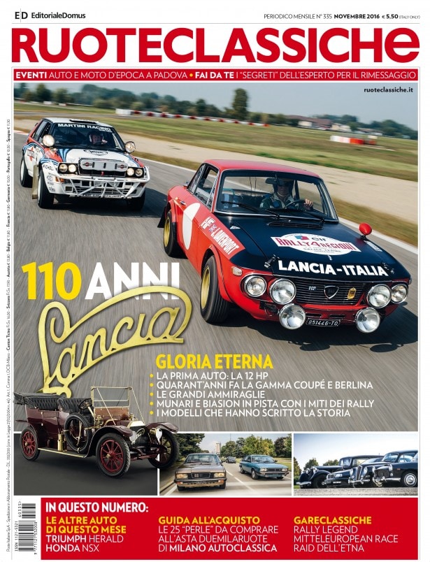 È in gran parte dedicato alla Lancia, in occasione dei 110 anni dalla nascita del blosonato marchio torinese, il numero di novembre di Ruoteclassiche: in tutto, una cinquantina di pagine per rivisitarne la storia, nonché l'avventura commeciale e sportiva. Si comincia con una "Regina del passato" d'inizio '900: la Lancia 12 HP Double Phaeton Miller Bros del 1908, dieci esemplari costruiti, solo tre oggi in Italia (quella del nostro servizio appartine e al collezionista Corrado Lopresto).