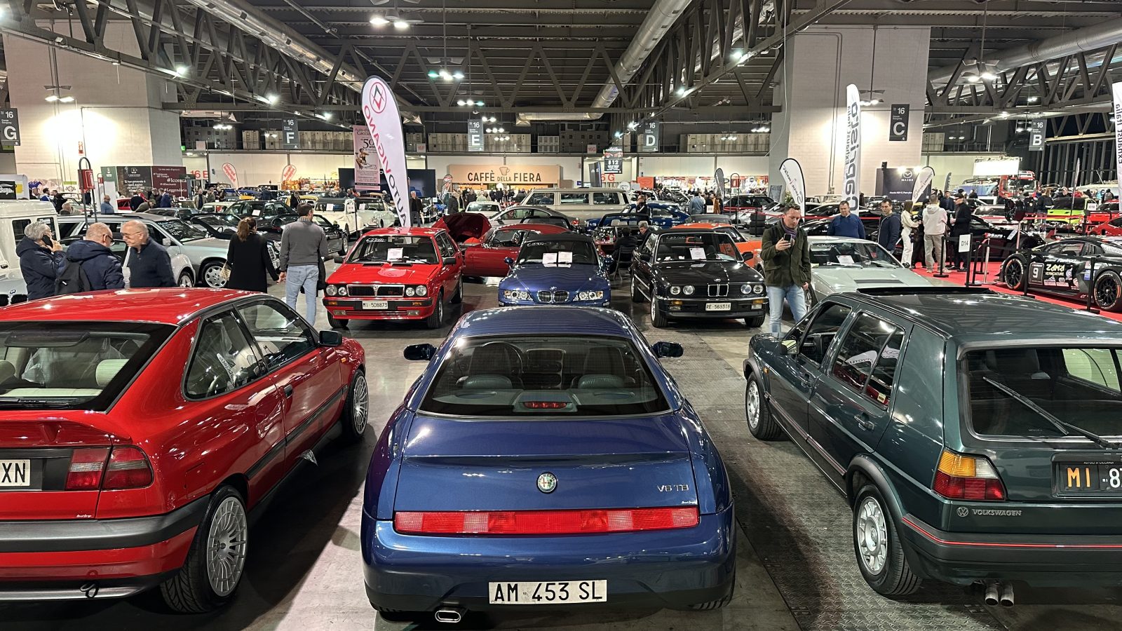 La BMW espone in fiera un esemplare di Z8: la super roadster dei primissimi anni 2000, firmata da Chris Bangle e ispirata alla 507 degli anni 50, porta con sé un fascino molto seducente. Il V8 da 4.9 litri e 400 CV, il cambio manuale e la distribuzione dei pesi praticamente perfetta le garantiscono poi un posto d'onore nell'Olimpo delle supercar. Una Fiat Panda non può mai mancare, e questa carrellata non fa eccezione: un esemplare della celebre utilitaria torinese in allestimento Cafè, del 1992, si presenta in un brillante rosso mattone, con il doppio tetto apribile - in senso contrario a quello di marcia - color crema come gli interni, che la rende quasi una cabrio. Con il suo alettone extra large, la Ford Sierra RS Cosworth, prodotta dal 1986 al 1992, non passa di certo inosservata, così come il sound del suo 2.0 litri dotato di turbina Garret T3, da maneggiare con cura. Tornando alle utilitarie, presente anche un'Autobianchi A112 Abarth del 1984 settima e ultima serie, la versione pepata della popolare vettura da città italiana che, grazie al suo 1050 cm³ da 70 CV e al peso ben inferiore alla tonnellata, si rivela una "piccola bomba". Piacevole imbattersi poi in una Mercedes-Benz 190E del 1985, il capolavoro firmato Bruno Sacco, in un particolare allestimento con tetto apribile, aria condizionata e rare targhe nere. Gli anni 2000 hanno sfornato una quantità non indifferente di compatte "turbizzate", come testimonia la seconda generazione della Opel Astra OPC del 2003, presente in fiera in colorazione nera al posto del classico Arden Blu. Double Six: una modello che, da solo, incarna tutta l'opulenza e la souplesse della Daimler, grazie al suo V12 da 6.0 litri, alla combinazione colori in perfetto stile british e agli oltre 5 metri di lunghezza. Con un'anima decisamente più racing, fa bella mostra un'altra inglese, la Jaguar XJ220, prodotta dal 1992 al 1994. Un nome, un programma, visto che la cifra indica la velocità massima dichiarata in miglia orarie, pari a 354 km/h, possibili grazie al suo 3.5 litri V6 sovralimentato. Frizzante come l'acqua che le dà il nome, la rara Citroën 2CV Perrier del 1990 si mostra in tutta la sua particolarità: scritte identificative ovunque e, soprattutto, un frigorifero per non rimanere mai assetati. 4.2 litri V8 aspirato e cambio manuale: un'altra era, nemmeno troppo lontana. Era il 2007 quando Audi presentò la R8, la supercar da 420 CV. E pensare che una RS3 attuale ha quasi la stessa potenza...